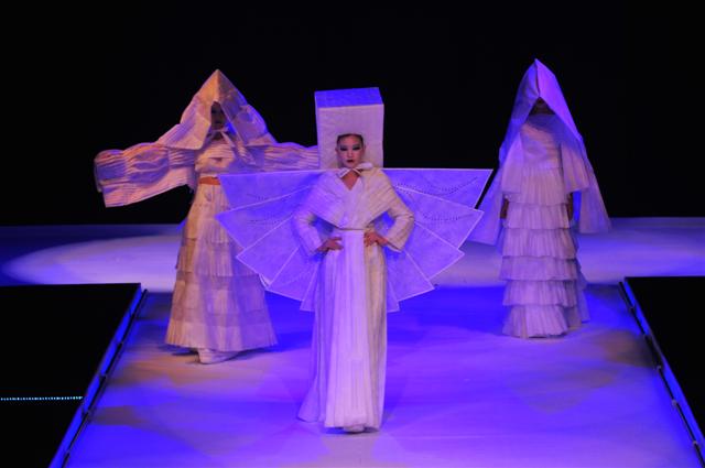 一段具有梦幻悠扬的音乐声渐渐响起,舞台灯光闪烁着迷离的印记,接下来呈现在观众面前的是彭波老师的设计作品,彭波是东华大学服装 · 艺术设计学院视觉传达系主任、副教授。在他的设计简述中这样表述自己的设计理念:“这不是一场服装秀,也不是一出情景剧。她是我艺术观念的瞬间折射,包括了对所有的崇拜与追求。她仅仅是一个载体,承载了我对美的理解。”整场秀着重视觉感,是设计师传递对美的理解的一种载体。其中包含了许多文明与他本人思想圣地的描摹。设计可分为七个主题,每个主题都有其鲜明的风格和思想内涵。第一个主题具有非常强烈的雕塑感,白色的体块柔软丰满,似带人登临云之彼端;第二个主题多运用兽皮,豹纹虎纹斑马纹交织出人与自然的共融,带来锐不可当的狂野激情;第三个主题的设计飘渺轻灵,素白的繁复肌理勾勒出神性,翅膀的造型反复出现,给人翱翔的冲动;紧接着的主题伴随歌剧倾斜而出的是浓郁的欧洲风情,假面与一把精致的小伞送来了浪漫的气息;第五个主题作品较少,面料运用反光材料,构建出未来感;第六个主题具有很强的性暗示意味,黑白色调强烈的反差反光面料大量的运用足以引起视觉上的愉悦;最后一个主题是最为华丽的设计,晚礼服的形式大气华丽,佐以特别的图腾,类似雪花、蝎子等。这一系列中也出现了特别甜美的晚礼服形式,似是对春天的致敬。