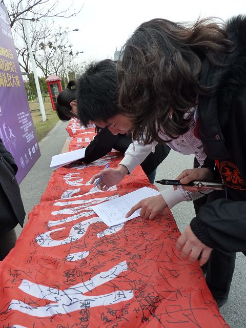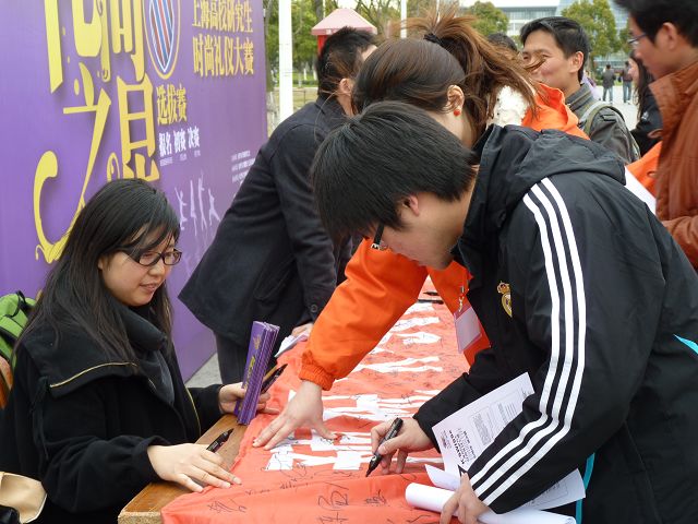 “时尚礼仪大赛”经过前几届的筹办与宣传,已经在同学们的心里有了深刻的印象,各届大赛中不同的主题又给了不同的乐趣与新颖,本届“世博缘·城市情”的宣传主题更是让同学们感受到了上海世博会的紧密联系,也更加的时尚,在我们工作人员饱含热情的宣传与推动下,松江校区的同学们对本届“时尚礼仪大赛”有了更深的了解,同时也引起他们的更加浓厚的兴趣。越来越多的同学在宣传横幅上签上自己的名字,积极地支持和参与此次“研究生时尚礼仪大赛”。