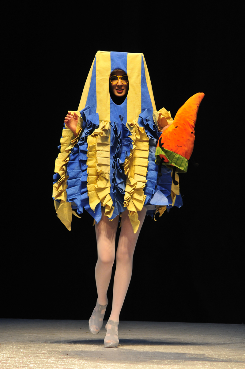 牛仔之韵,带给观众的惊喜层出不穷。抽丝、滚边、扎染、褪色,各种工艺搭配的恰当运用,赋予了牛仔新的生命。及膝的牛仔衣裙饰以披肩,经过喷漆处理的面料,给人古装的美感。夸张的灯笼型衣服设计,整个人包裹其中,展现了设计师天马行空的灵感。淡蓝牛仔配上白色的蓬蓬纱,甜美可人的小礼服裙带给人小小的清新之感。不论是适合日常穿着的设计,抑或是夸张的舞台装,充满创意的对牛仔的服装设计,打破了人们对牛仔适合做裤子的单一认识。