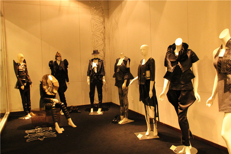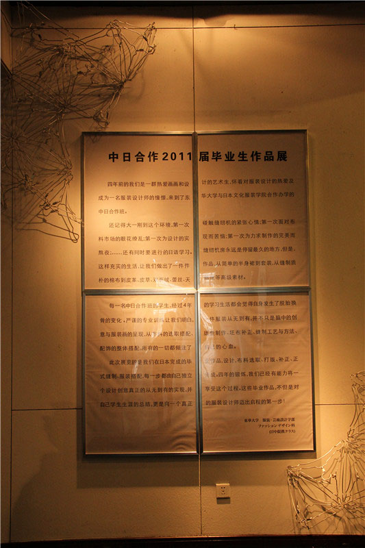 静态展的另一部分是中日合作班服装。本次展出作品是服装艺术设计专业中日合作班学生在日本学习期间由日本文化服装学院的教授指导设计制作完成,是中日合作班学生整个四年学习成果的一个总汇。三年国内学习,一年国外深造,将同学们打磨得更加成熟。从设计、选材到制作完成,历时两个月。在长期国际化课程的熏陶下,学生授业于不同国籍的导师,了解不同的设计文化和模式,吸收众之所长。在设计上具有东华大学服装设计专业的创意效果,在结构和工艺上具有日本文化服装学院的严谨和精致。这些都是自2003年9月中日两所世界著名的服装院校正式启动国际合作办学学位教育以来,中日双方教师辛勤耕耘取得的的喜人成果。