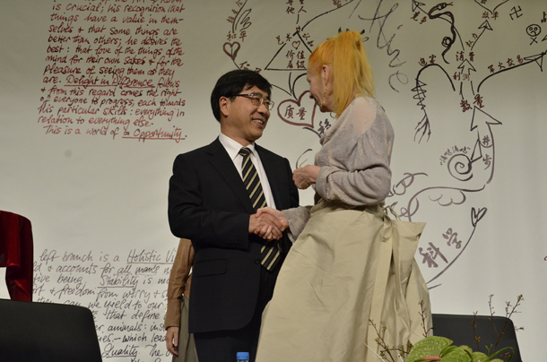 11点将至,薇薇安·威斯特伍德女士在同学们期盼的眼神中、热烈的掌声中进入会场。就座后,作为主持的李院长首先欢迎了设计大师薇薇安·威斯特伍德女士的到来,并向在场的观众和媒体朋友们介绍了在场的领导和嘉宾。他们是上海市东华大学党委副书记殷耀先生、上海市文化创意产业推进领导小组办公室副主任贺寿昌先生、上海市东华大学包铭新教授,以及薇薇安·威斯特伍德女士的工作伙伴。