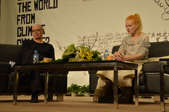 之前进场时,每个人手中都拿到了一张薇薇安女士手绘的谱系图,上面即是此次演讲的大致内容,这张谱系图为“大地之神盖亚”和“科学”的结合,图中的两个分支是他们的两个孩子“数量quantity”和“质量quality”。分支的右边为数量,当数量与进步相结合,便会产出大量的消费以及利润,随之又产生出两个分支——竞争和权力,以至于带来一系列的过度开发和灾难。左边的分支为质量,当质量和稳定性相结合,才出现了真正的和平、公正和良好的生活品质,才能成就“艺术”,有了艺术才有文化,伦理道德和社会构架。所以艺术是良好社会环境的基础,艺术爱好者是美好世界的自由战士。在提到购买服装时,薇薇安女士也提到希望我们能够“buy less,choose well,make it last”,为环保事业做出贡献。