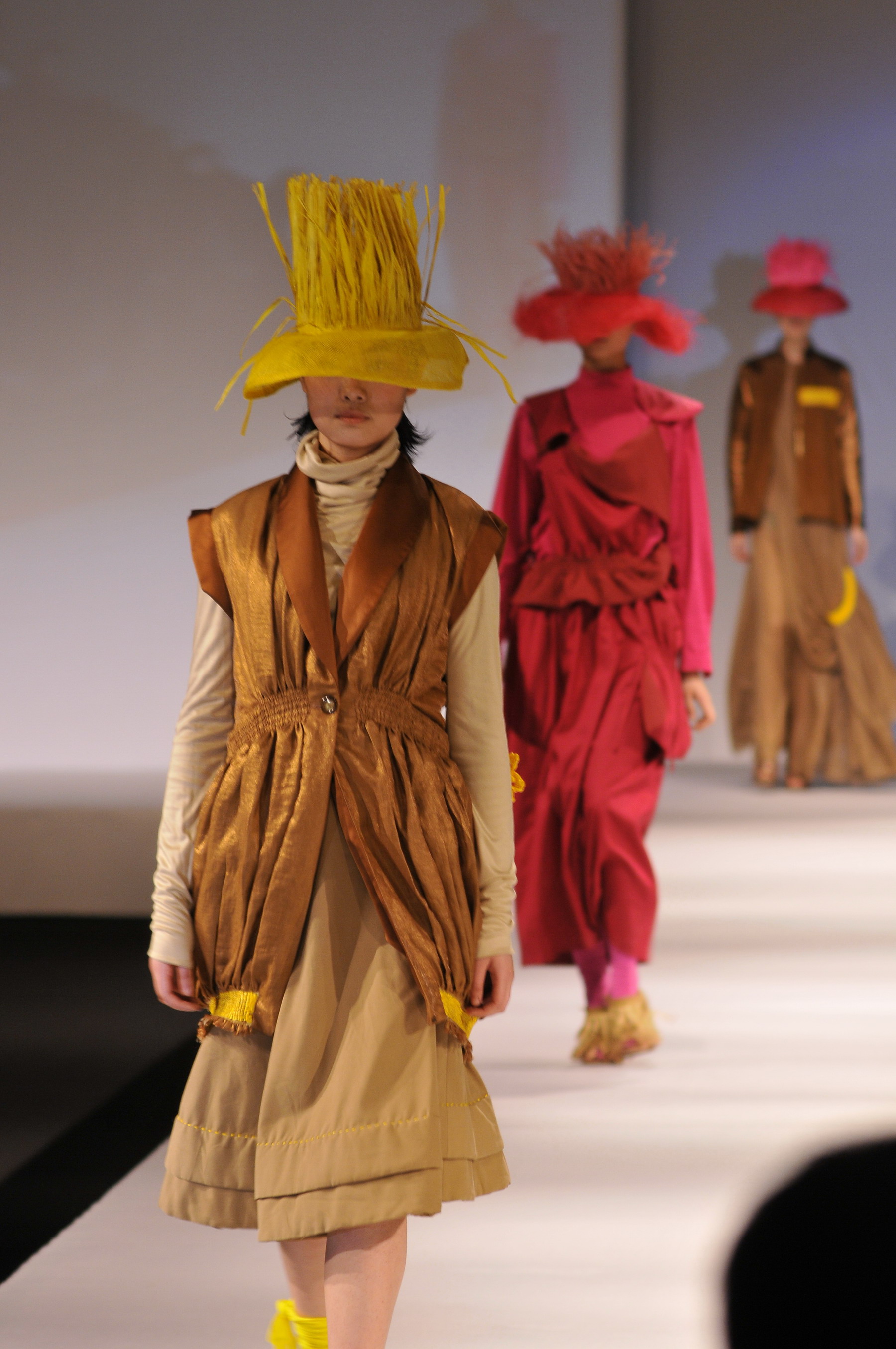 随着鼓声渐去,银幕上显现出一个圆环,象征着东华时尚周已扩大至“环东华”的规模,更预示着它将引领上海的时尚界走向国际。极富现代感的音乐响起,模特从神秘的后台踏出,首先映入眼帘的是黑红色调的男士西服,搭配极具现代感的密集针状条纹和爆炸图案设计,完美融合了男性风度与热情之美,而纯色的西服和低调的黑衬里更显设计师对男装独特的把握。随后,音乐转向柔和,舞台上也出现了女装的身影。一系列的暗色系宽肩长裙,时而左右时而内外的双拼色,突出了女性的华贵与率性;而露趾的高跟鞋加之偶尔出现的流苏,也让画面鲜活不少。忽然,一抹靓丽的玫红男装让观众眼前一亮,这稍显突兀的夏日风潮显然是又一位设计师的杰作。轻松的浅棕色凉鞋、同样粉红的鸭舌帽、条纹状的透明处理,夏日的热浪仿佛扑面而来。而此刻,设计师似乎给观众们开了个小玩笑:印有人头像的上衣搭配同色的短裤,如同是画像中的人物朝观众走来。还未欣赏完前一组的意味,又一套神秘的女装出现在眼前。头顶“种着”“塑料草”的宽沿大帽,里着皱褶柔美的丝质衣裙,外套垂坠的厚布外衣,搭配随意扎起的长短袜和手肘处的传统编织工艺,件件夺人眼球。怎么,你要说你已经眼花缭乱了?那还是让这个舞台为您放松眼球吧。下一位设计师巧妙地运用了黑白条纹的视觉错觉,形成了奇妙的扩大效果。此后,波西米亚风格的方帽与裙装、简洁的米色布料与方形手包、夸张的大片皮革、多层的结构设计、亮片的独到运用、水墨的晕染效果……每一位设计师都为观众带来了独特的视觉体验。