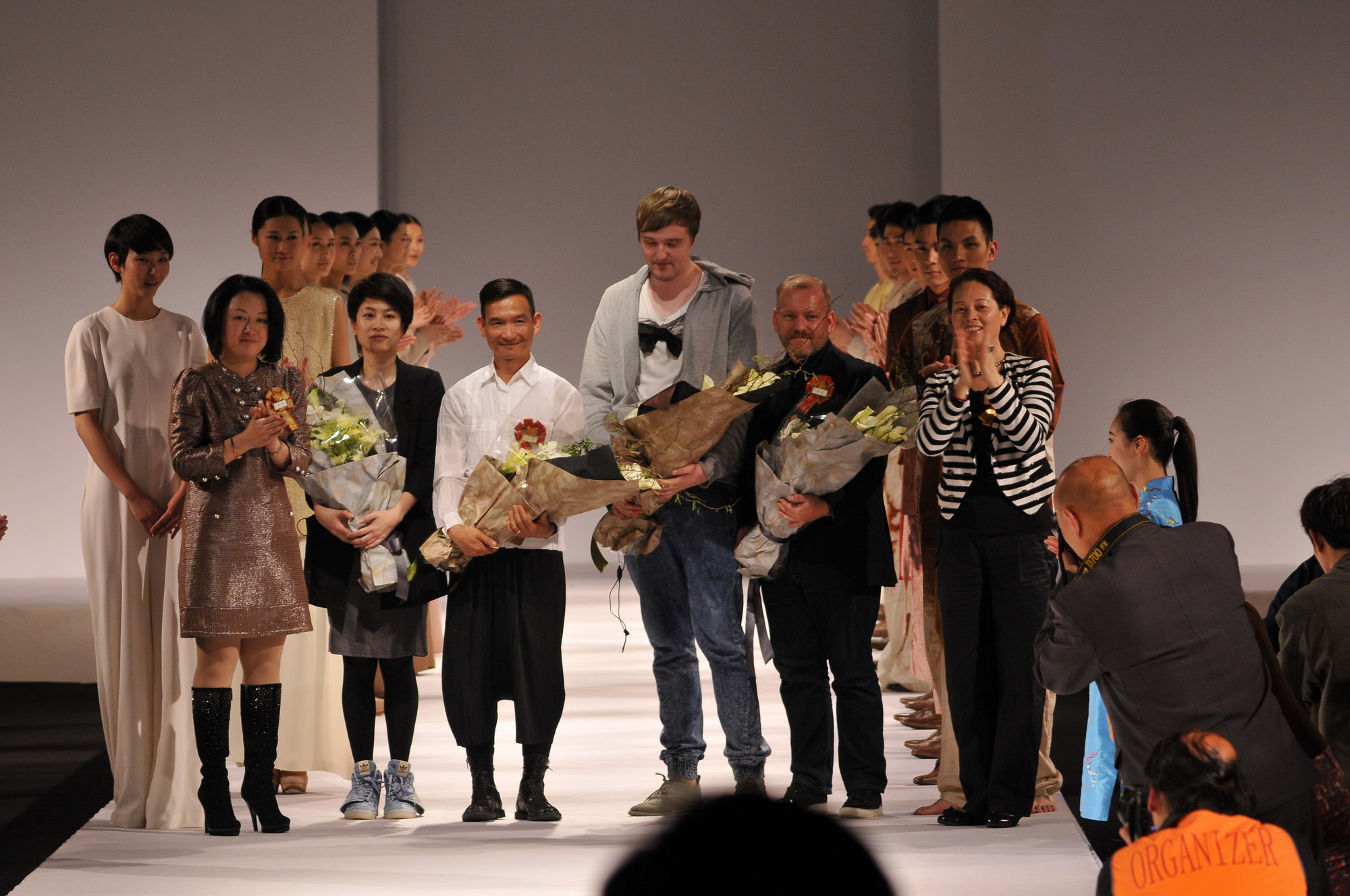 展演的最后,男女模特们齐齐亮相,设计师缓缓从中走出。在掌声与鲜花的交织下、在一片闪光灯的闪烁中,由刘春红副校长和李柯玲院长为伦敦时装学院的代表们送上了鲜花和感谢。