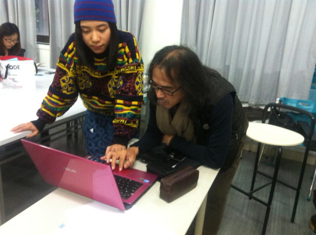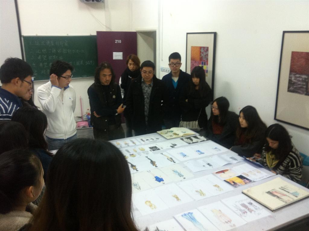 岩佐老师与服装设计系同学课余进行针织服装设计图稿讨论