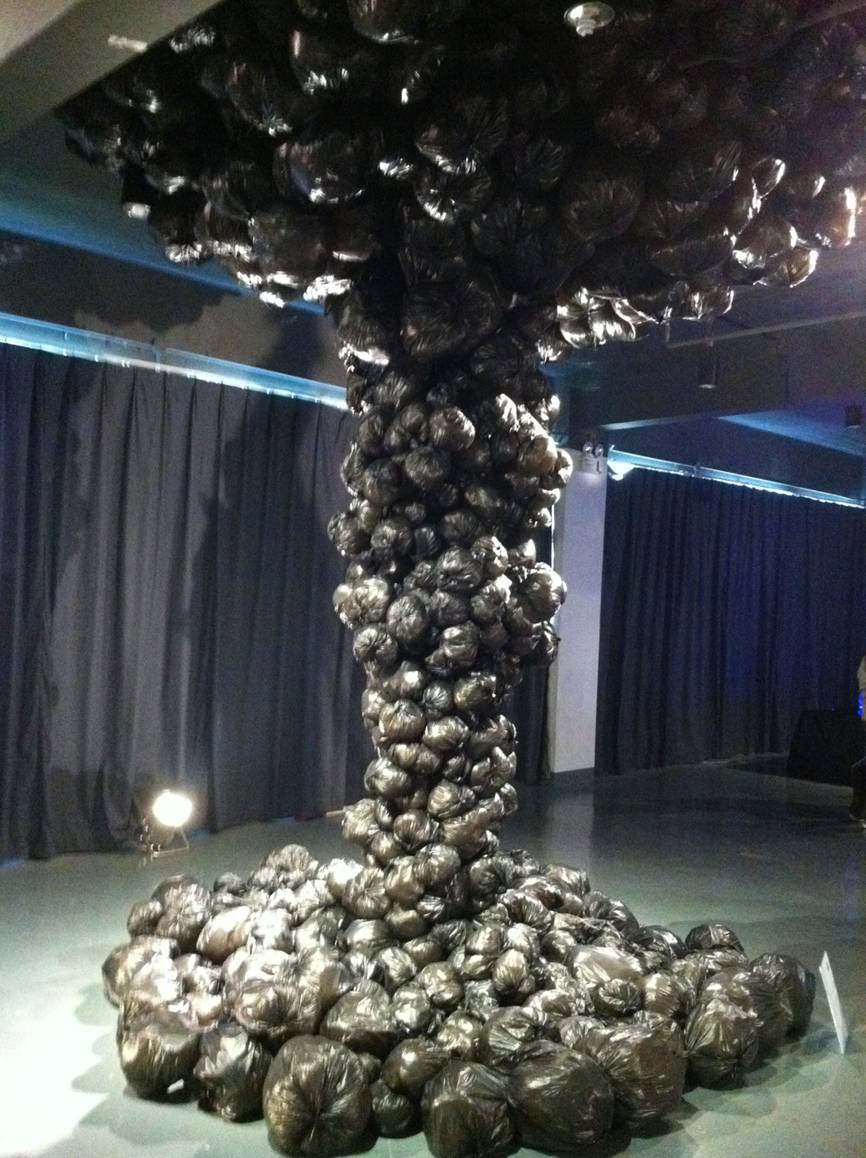 除了作品之外,本次更有作者亲临现场,《种钟终》的作者张意同学还亲自来到现场,化自己为作品的一部分,用行为艺术向大众展示自己的理念,寻找那个真心懂的自己内心世界的观众。他还很友好的向一部分观众解释着自己的作品,试图让更多的人去体会理解他所创设下的意境。还有张书淇同学带来的《爆裂》,黑色垃圾袋制成的硕大的蘑菇云,让人一进展馆就注意到它,色彩加上压迫感十足的造型,给人一种压抑之感,似乎时时刻刻在警醒人们:再不保护环境,地球将变成下一个切尔诺贝利。于此同时,其他同学带来的作品也都非常惊艳,许多社会上的知名人士也作为嘉宾亲临现场,驻足观看,为这些年轻设计师喝彩。