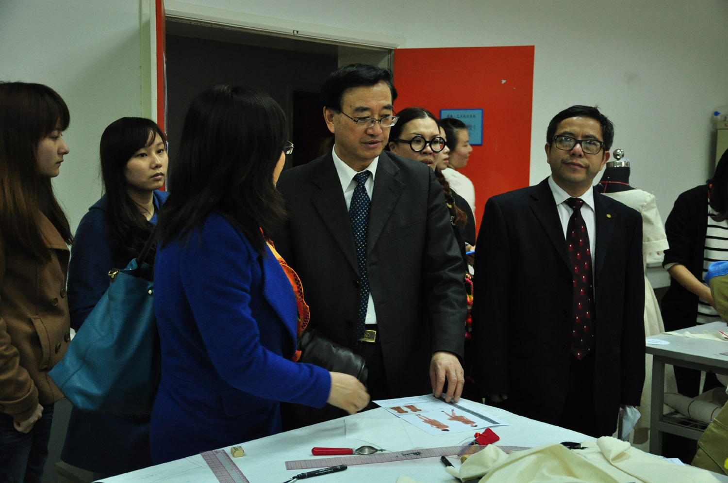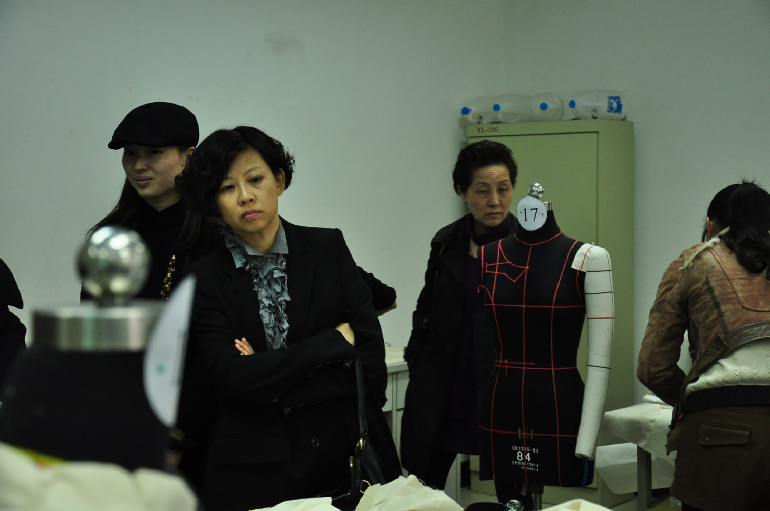 现场操作比试期间,许多同学和老师都前来观赛,但选手们全神贯注丝毫不受影响。各种形式的立裁方法展现在大家眼前,令大家大开眼界的同时也不禁感慨立裁这种造型艺术的奇妙。本次比赛,东华大学张文斌教授、韩国淑明女子大学孙喜顺教授与张喜景教授以及上海纳薇服装设计有限公司的技术总监周云霞作为特邀评委对选手的表现分五大部分进行分别打分,总分为120。同时中国纺织工业联合会副会长徐文英先生和纳薇董事长牛冬梅女士也莅临现场参观指导。