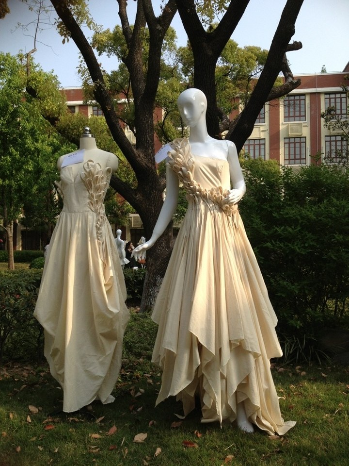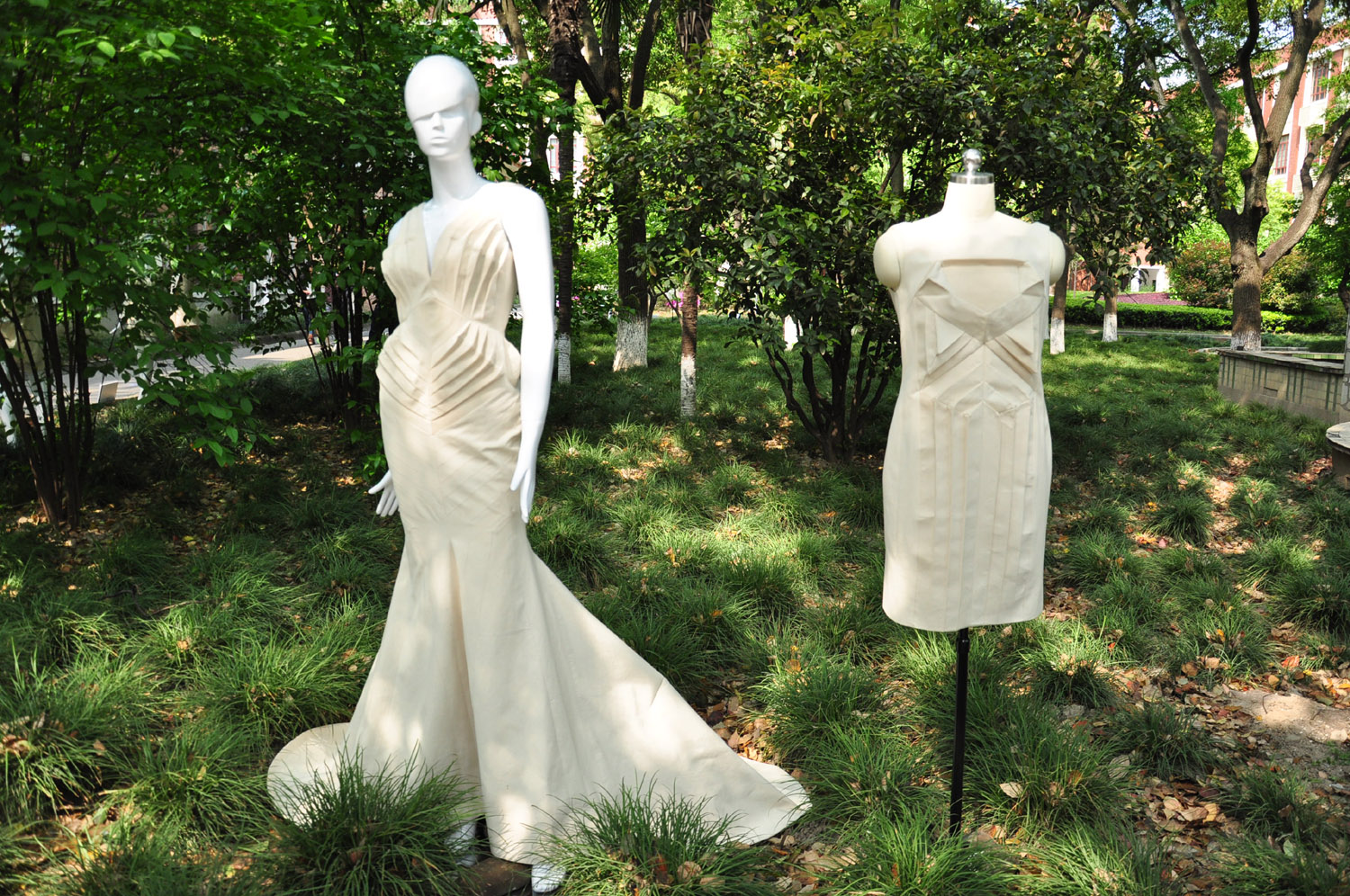 在现场操作比赛进行的同时,静态展也吸引了众人闻讯而来。本届静态展大赛形式创新,花园为展台、大树为映衬,效果惊艳。碎石小径、阳光小草、参天古树,映衬立裁时尚、现代设计。白坯布静态展示评比的创意成衣、优雅礼服犹如美轮美奂的素颜美女,不染脂粉、安静高雅、大气美艳。现场也设立投票KT板,参观者积极参与现场投票。