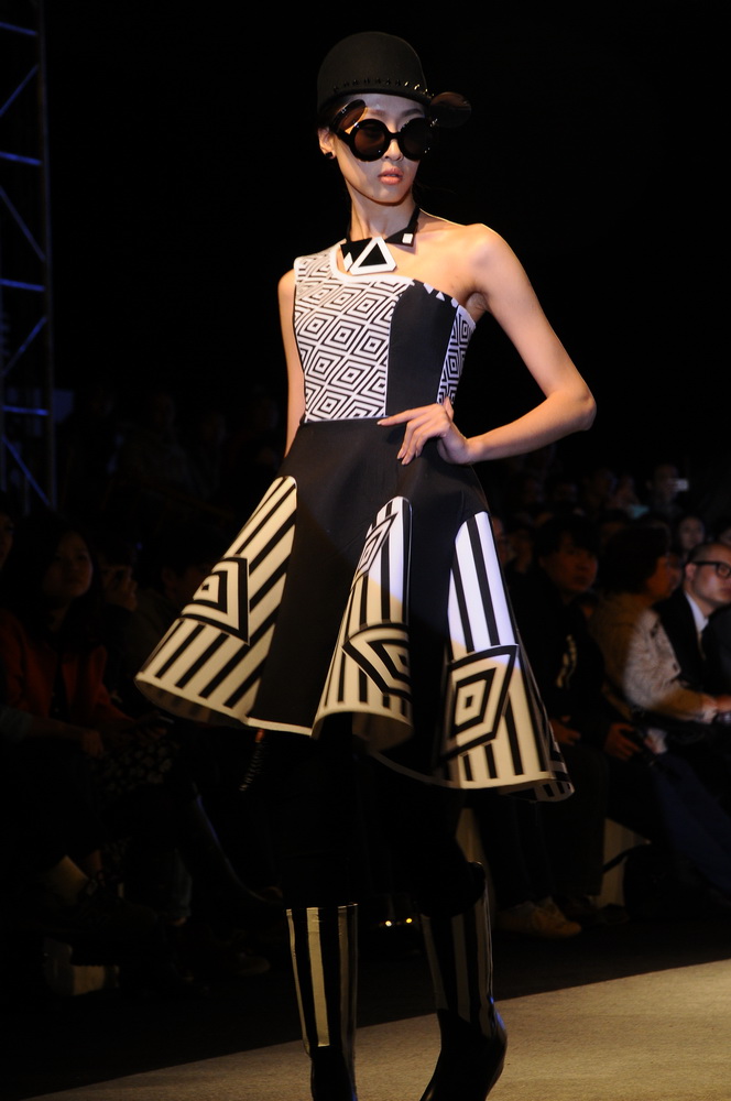 会场内,主持人简短的开场之后,灯光打破了昏暗的舞台,伴随着节奏感强烈的音乐,呈现在观众面前的是设计师独特的想法和华丽的裁剪。本次学生作品的款式都非常创新,完成度较高,也表现出了自己对服装的想法与看法。面料的选用和剪裁的方法多种多样,有对图腾和镂空纹样的设计与应用,也不乏编织和印染的视觉冲击,许多选手选用了雪纺纱和绸缎作为主打,同时也看到不少将质感轻和质感较重的面料相结合进行对比应用的设计。选手们不仅在服装上下了功夫,配饰的设计搭配上也给观众一种眼前一亮的新鲜感,例如一等奖获得者幸雪同学设计的形态各异的铁丝镂空帽就吸引了全场的眼球。