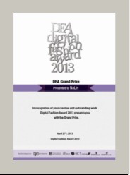 Digital Fashion Award由Korea Fashion Association, Digital Clothing Center, MCST 主办,全球范围征稿,今年为第二届赛事。大赛评判选手运用数字化技术进行服装设计的时尚性和结构性特征,并着重考察运用虚拟技术进行服装设计和展示的能力。奖项设置为Grand Prize,1st Place Prize,2nd Place Prize,Honorable Mention Prize,Prize Winners等5个类别。