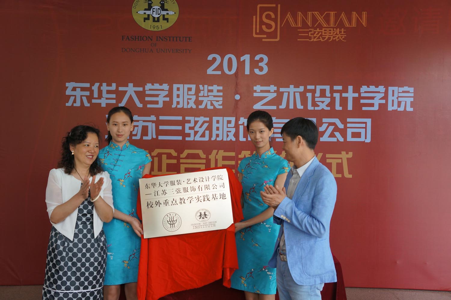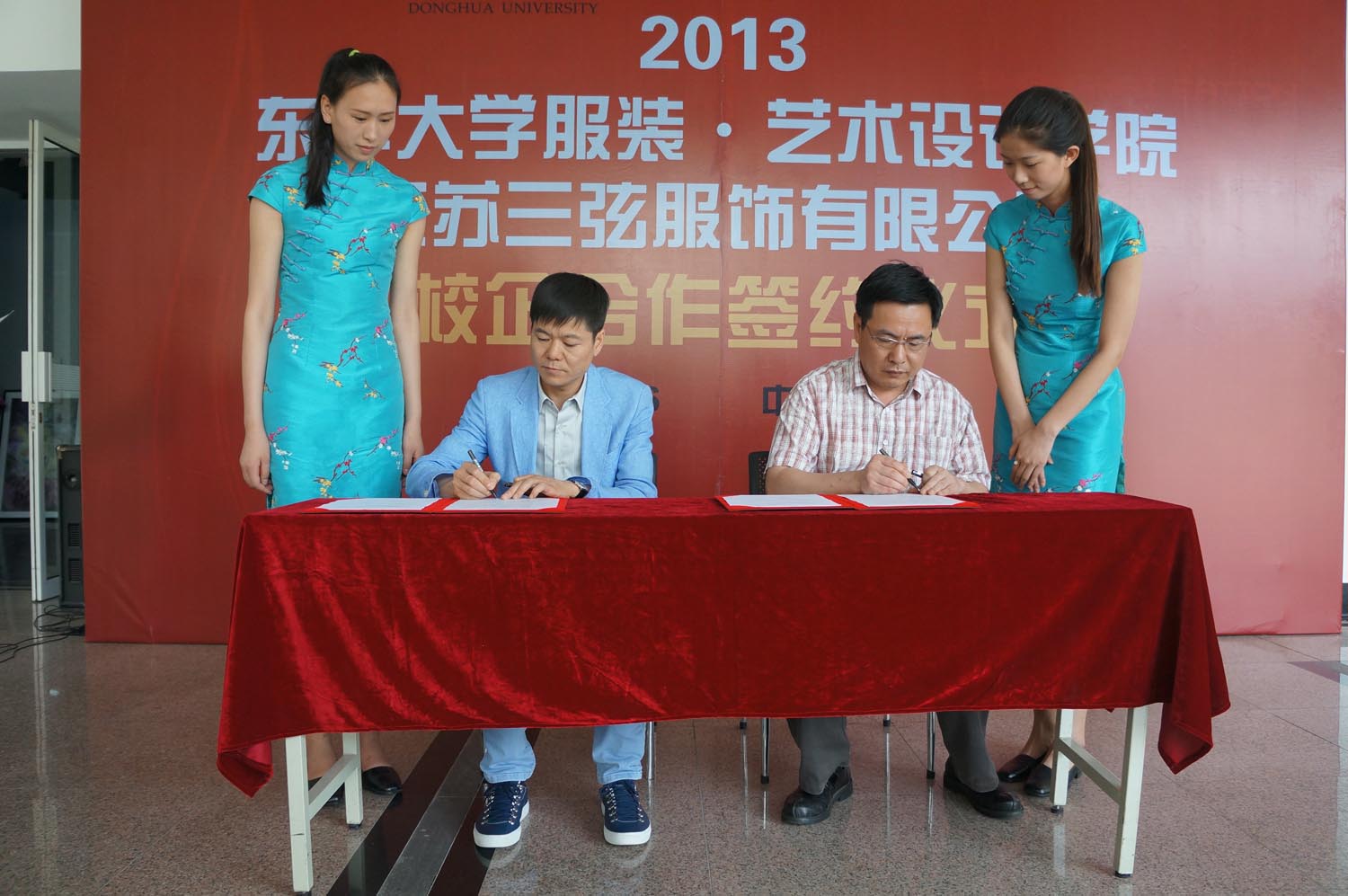 2013年6月6日上午,在东华大学逸夫楼举行了东华大学与江苏三弦服饰有限公司校企合作签约、捐赠仪式,东华大学副校长兼服装•艺术设计学院院长刘春红、服装•艺术设计学院党总支书记袁孟红、副院长刘晓刚、校发展联络处副处长徐晶、江阴市长泾镇副镇长陶郁俊、党委副书记周衡志、江苏三弦服饰有限公司董事长吴栋标一行出席了签约仪式,由我校挂职祝塘镇党委副书记委员会董平军主持。