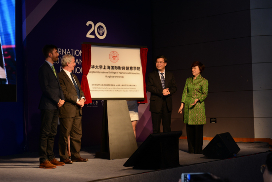 教授与英国爱丁堡大学校长Sir Timothy O’Shea,副校长、艺术学院院长Professor Christopher Breward一起上台为“东华大学上海国际时尚创意学院”举行了揭牌仪式。