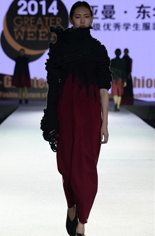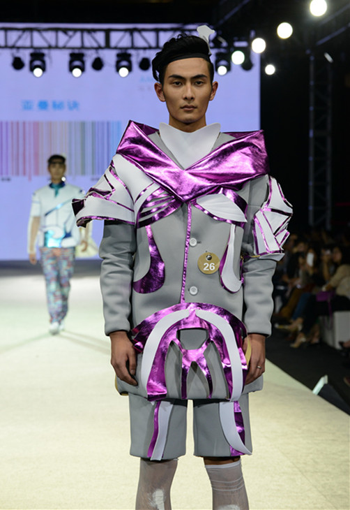 在35组作品中,六组作品脱颖而出,分别是三等奖:5号,8号,23号。二等奖:12号,29号。一等奖:33号。其中5号作品以深灰,浅灰为主色,巧妙地运用了两者相间所形成的条纹丰富了衣服整体,休闲而不失时尚。8号系列采用了亮色花案与白色巧妙拼接,款式简练大方。23号系列将蜘蛛网般的镂空样式大胆装饰于男装的下摆及袖口。12号系列以针织布料为基础,其中带有皮毛裙边的连衣裙给人以甜美活泼的感受,该套系列里还多次出现骆驼的图纹,与该服装色系相映衬。29号系列结构奇特,变形金刚摇身一变成为了模特身上的时尚标志,服装背面出现机械蝎子尾巴形的装饰物,给原本的女装灌入了科幻元素。最后揭晓的是出人意料的钢架衣服,白色金属酷似耳机置于头顶,上面垂下的丝线连接了衣服,融为一体。此次学生们的作品都以简洁的版型为主,通过材料本身的特性来表现作者想表达的含义。