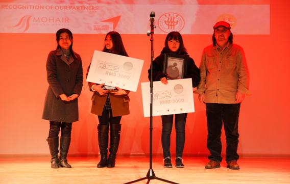 图2南非马海毛协会CEO Deon先生、服装艺术设计系主任汪芳为三等奖周玮、洪倩雯、沙河同学颁奖