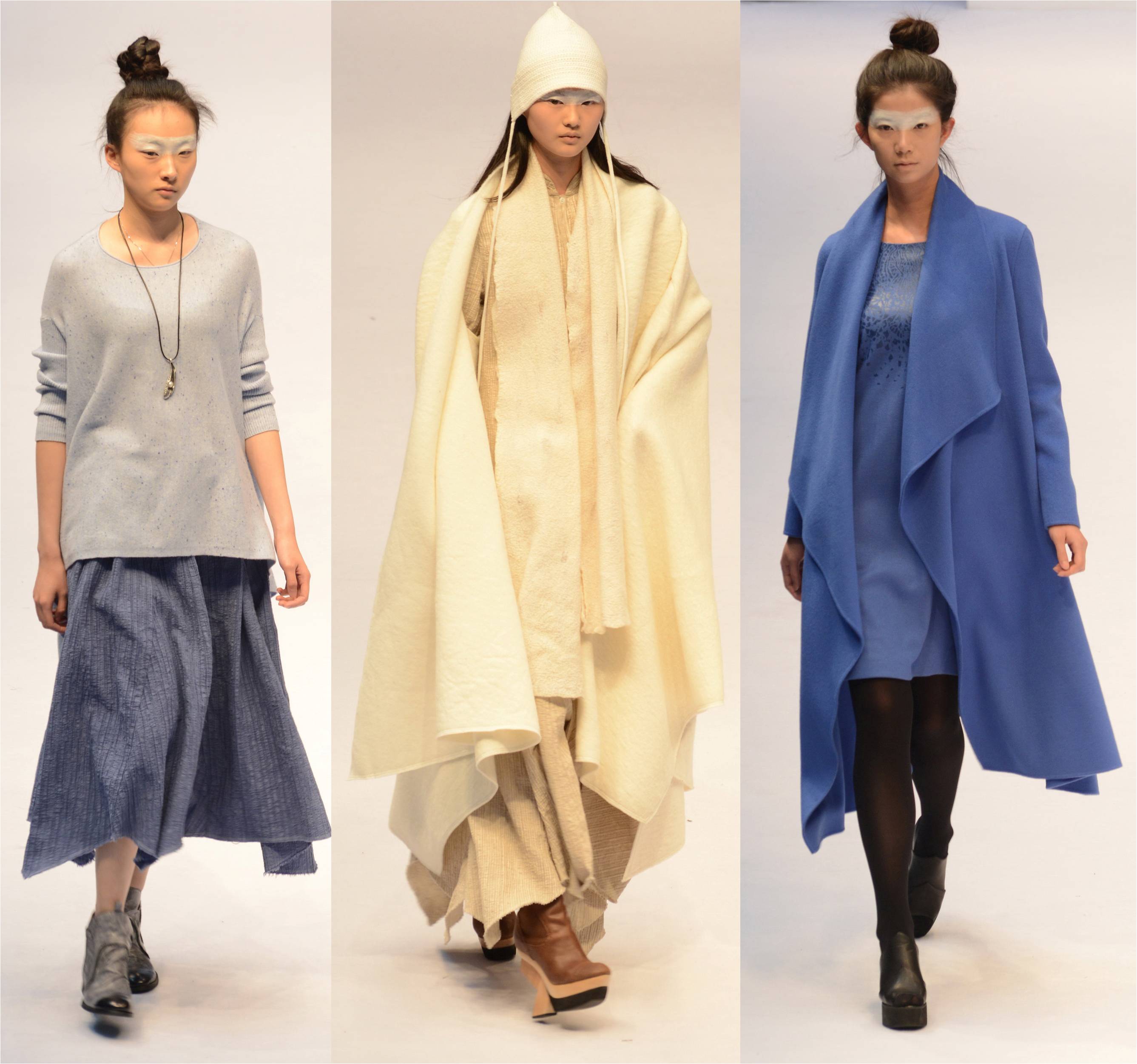 作品大量选用高级的意大利及日本面料,使用全天然素材,如:棉麻丝与羊毛,及全天然的混纺主体材料。
