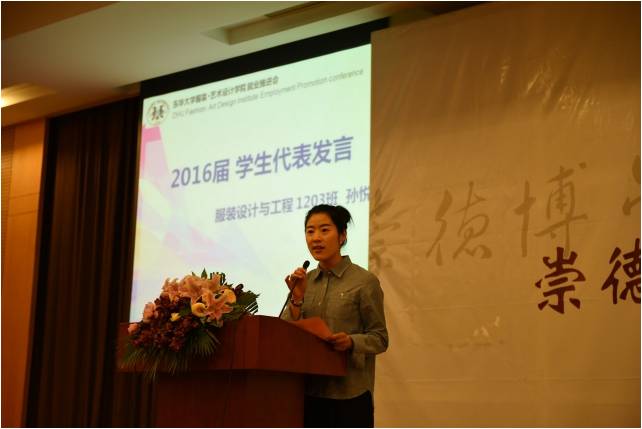 服装学院党总支书记袁孟红致辞,代表学院对前来参会的企业表示热烈欢迎。袁书记表示,我院始终坚持产学研紧密结合,走开放式办学道路,致力于推动学院和企业的共同发展,力争培养具备创新意识、市场开拓能力和娴熟技艺的高素质人才。袁书记还指出,此次就业推进会旨在拉近企业与学生距离,使学生能够深入了解企业对人才的素质要求和招聘过程关键点,为同学们的顺利就业提供指导和帮助。服装学院2016届本科学生代表孙悦同学从学生就业的角度向到场企业嘉宾就职业规划、素质提升等方面提出疑惑。