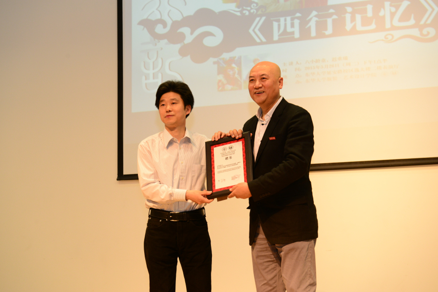 演讲开始前,服装•艺术设计学院李俊院长为六小龄童先生和迟重瑞先生颁发了兼职教授聘书并为他们佩戴校徽,现场观众报以雷鸣般掌声,对两位艺术家的到来表示热烈欢呼。