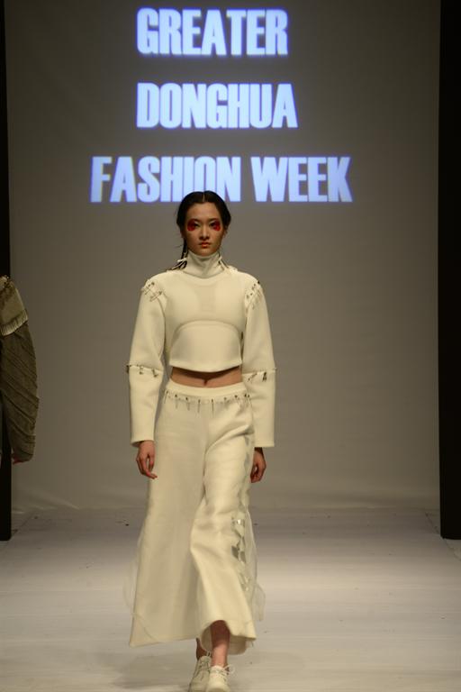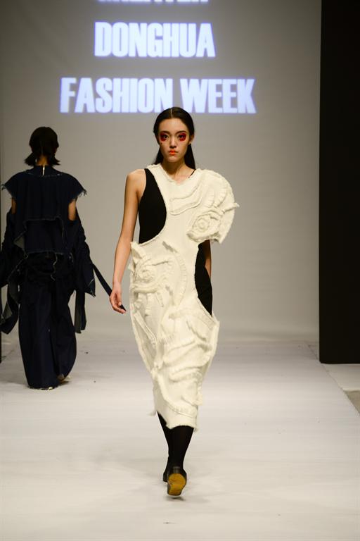 西藏大学的民族风留给观众无限的震撼和回味。紧随其后的,是精彩的2016“雅莹·东华杯”中日合作优秀毕业生作品发布。发布会由浙江雅莹集团有限公司特别赞助,展示了68名毕业生共73套优秀作品。这些作品均为他们在日本文化学院交流学习时期制作,体现了中日合作专业融创新性、时尚性、技术性于一体的办学理念。中日合作班的学生设计师力求每件作品工艺精致,或是运用解构主义实现结构的变化;或是通过染色、印花等多道工序和大量手工制作,对面料进行再造处理,从而达到设计需要呈现的表面肌理和色彩变化效果。