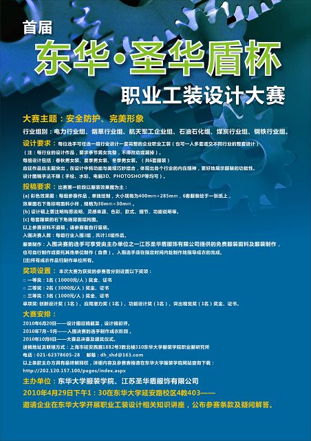 为保证对作品的正确评价和导向,将邀请东华大学领导及资深专业教师、江苏圣华盾服饰有限公司领导及专业人员等共同组成评委;为保证作品遴选的公正性上述评委名单将于宣布评奖结果的同时公布。