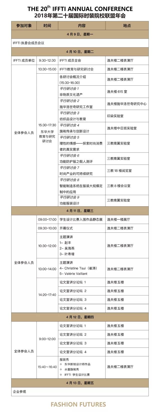 本届年会主题为 “Fashion Futures”,涉及集成和开发设计、技术与材料创新、商业与产业发现、文化传承与发展、教育多元化五项议题。议程持续五天,主要包括主题演讲、论文宣讲、设计大赛和参观研讨等学术交流活动。