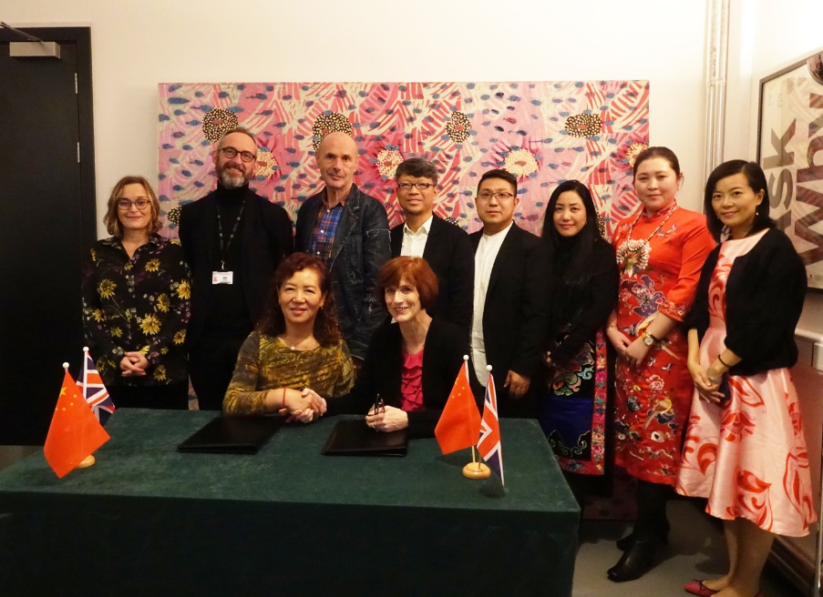 此次活动中展出的26套服装是近两年在我校举办的非遗传承人刺绣研修培训中,中英两所学校的服装设计专业学生结对共同创作时装设计方案,并与非遗传承人合作完成刺绣元素在服装中的运用而形成的作品。作品风格各异,既有传统刺绣等东方元素,又穿插了前卫、嬉皮的西方元素,体现出东西方文化的完美交融。这些作品将传统刺绣手工艺、民间图案及色彩与现代时装设计理念融合,时装的廓形或优雅、或夸张,充分展现了两校学生合作的全新创意。曼城大的师生对这次展演表现出极高的热情,英国学生抢着当模特,把浓厚的中国传统文化表演出另类的英伦风范,曼城大师生直观感受到中国非遗文化的独有魅力、东西方文化撞击迸发的灵感,这是一次院校之间关于设计、关于文化、关于教育的全新合作。展演前,袁孟红代表学院与曼彻斯特城市大学国际部主任Abigail Gregory签署两校教学合作协议。