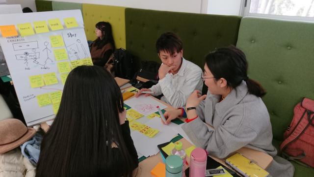 在进行完实地调研后,将开始为期四天的研修课程。分组采取三人一小组、中方学生和日方学生混合分组的形式,促进了中日同学间的交流。项目进行期间,ALGIRDAS老师和久米老师给出许多中肯的建议与意见,小组间合作积极,气氛融洽。