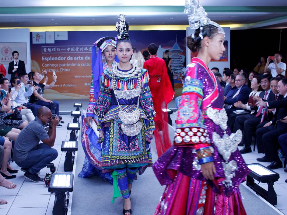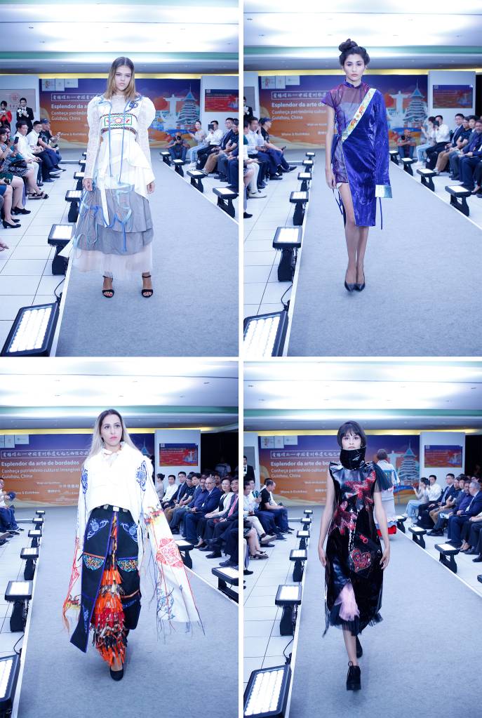 来自巴西的模特现场展示的“贵绣”服装包括27套由东华大学“传统刺绣创意设计”培训班的同学们设计的服装, 12套贵州苗族蜡染服饰和3套贵州民族服饰,受到在场观众的热烈欢迎和广泛好评。