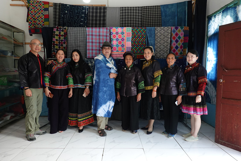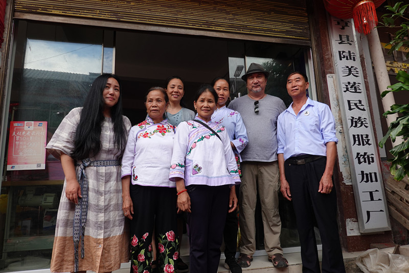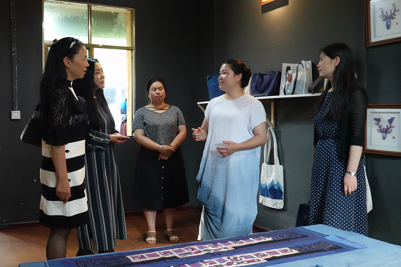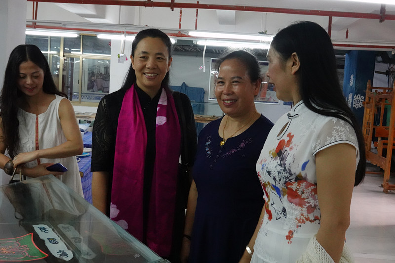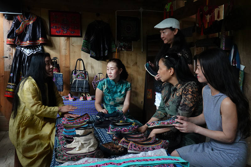 回访东华大学五期学员查兰菊(左二):现场切磋如何结合布依族刺绣开发鞋子和包包