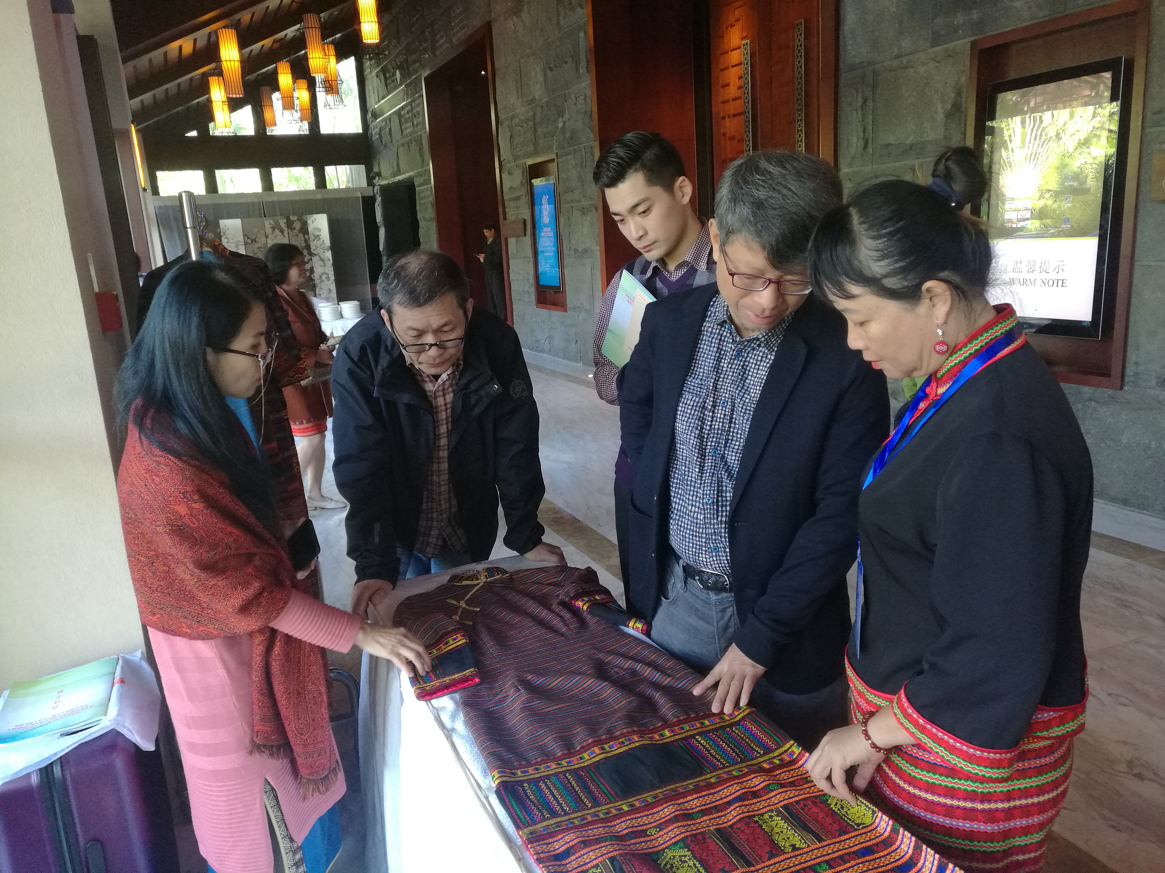 陈彬教授与传承人对黎锦旗袍进行设计和工艺探讨