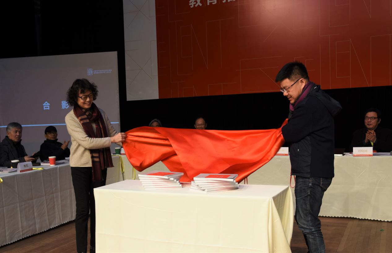 全国艺指委秘书长丁凡教授与上海戏剧学院院长黄昌勇教授为新书揭幕(《上海艺术专业学位研究生(美术、艺术设计领域)优秀作品集》)