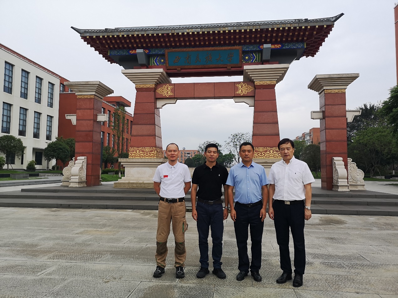 西南民族大学党委副书记、副校长三郎扎西(右二)、建筑学院院长赵兵(右一)与余继宏老师交流留念