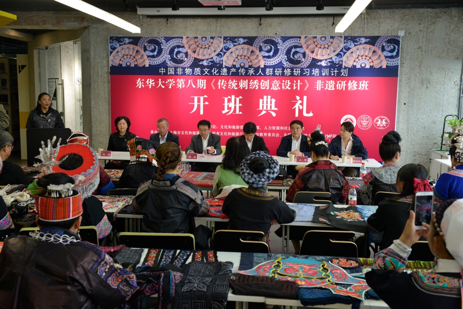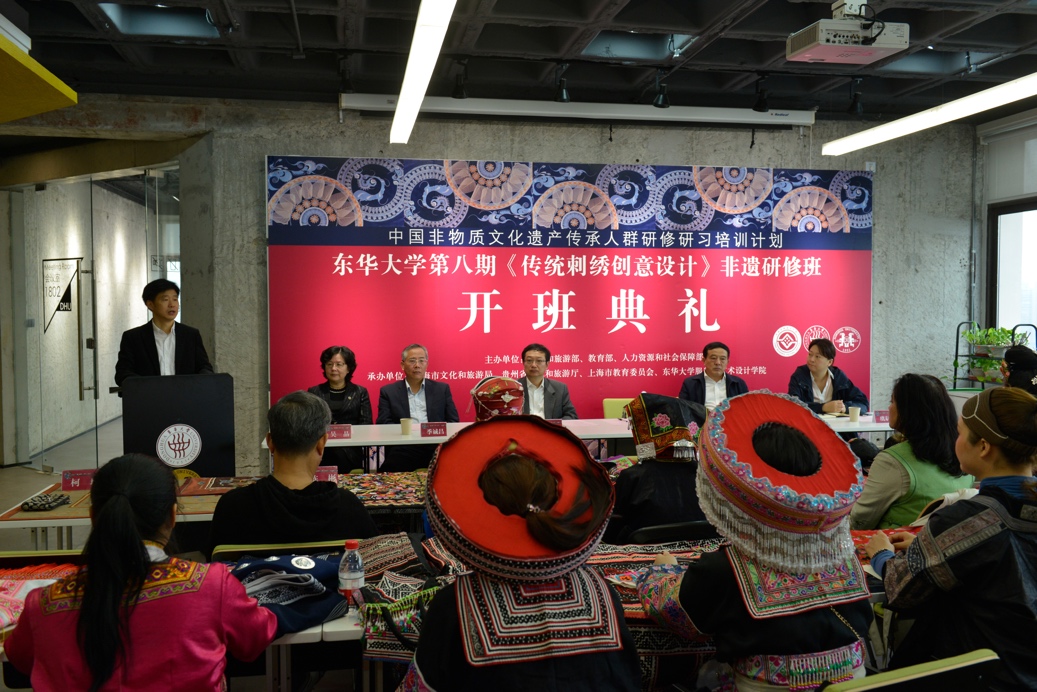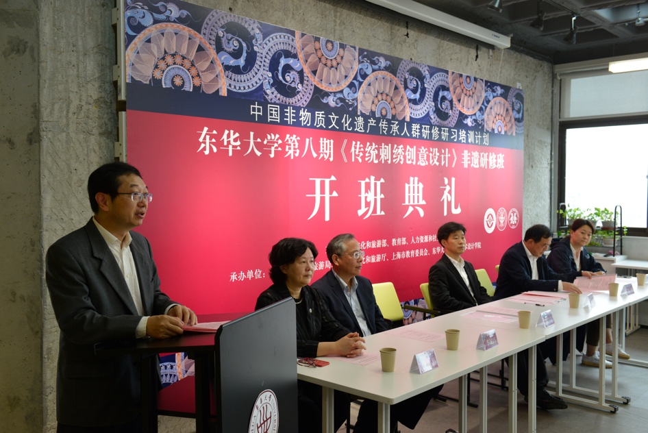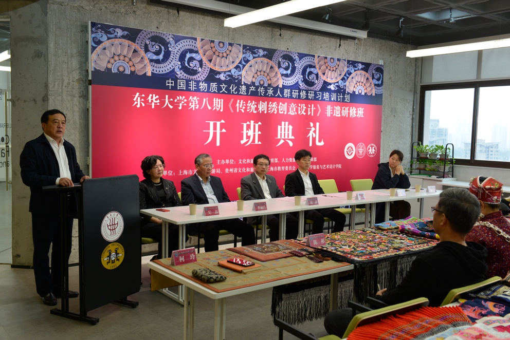 2020年10月20日,东华大学第八期中国非物质文化遗产传承人群研修研习计划“传统刺绣创意设计”研修班在延安路校区开班。东华大学副校长邱高、手机博彩平台betway必威安卓版 院长李俊、遵义市文体旅游局原副局长王华先生出席开班仪式并致辞,手机博彩平台betway必威安卓版 党委吴晶书记、东华大学科学研究院季诚昌处长、东华大学党委宣传部虞晨洁副部长等相关领导及部门负责人和全体非遗研修班学员一同参加活动。