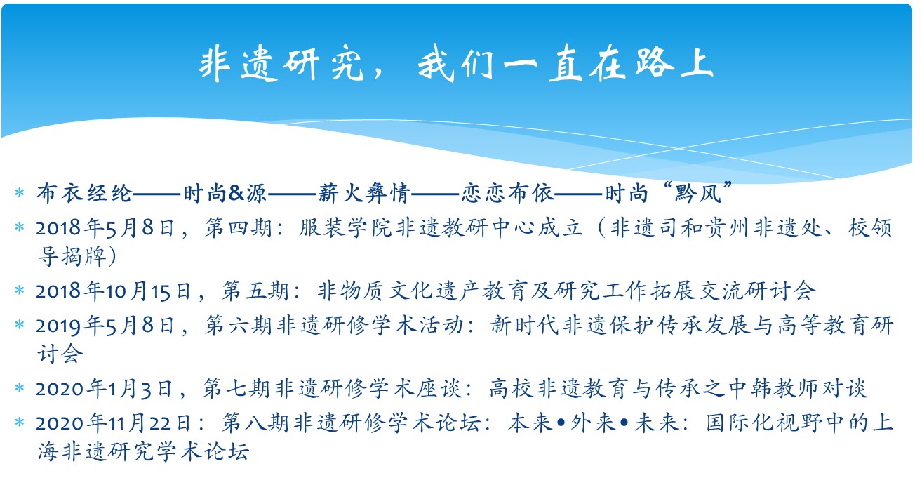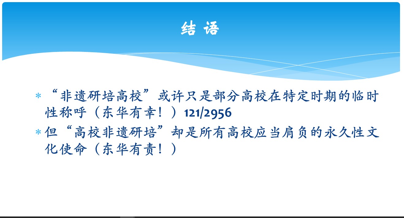 最后,柯教授通过东华大学非遗研培工作以及自己近20年的非遗教育学术探索之路,介绍关于非遗研究和高校学科建设的最新研究成果。指出“非遗研培高校”或许只是部分高校在特定时期的临时称呼,但“高校非遗研培”的文化使命是长期的,东华大学作为我国121所从事非遗研培的高校之一,将责无旁贷做好非遗文化的传承创新工作!