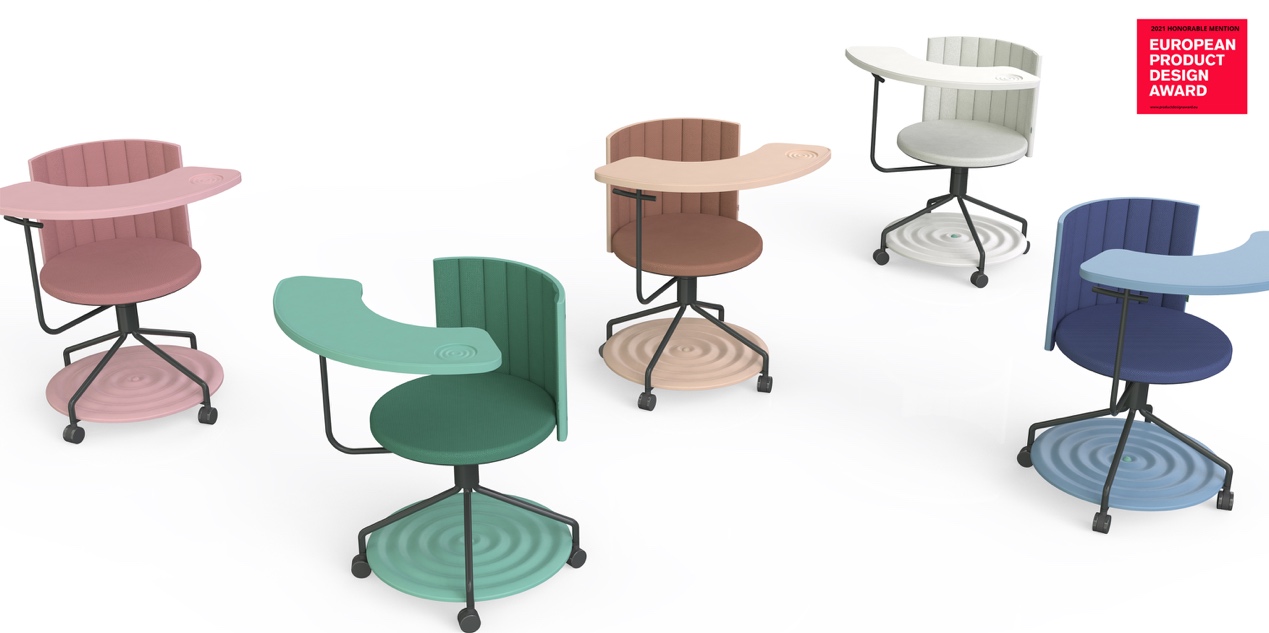 这是一款面向中国高校,为“浙江惠美”开发的一款小规模教室讨论用家具。设计团队以中国文化中的“涟漪”意象为设计灵感,取名为“Lian”,寓意该产品构建学生、老师、教室之间的一种连接。学生可根据需要灵活移动前面小桌板,达到学习、休闲、沟通等不同需求,也可小组自由组合桌椅。该作品实现了产品功能、造型与生产之间的平衡,兼顾了个体愉悦体验与集体需求满足。