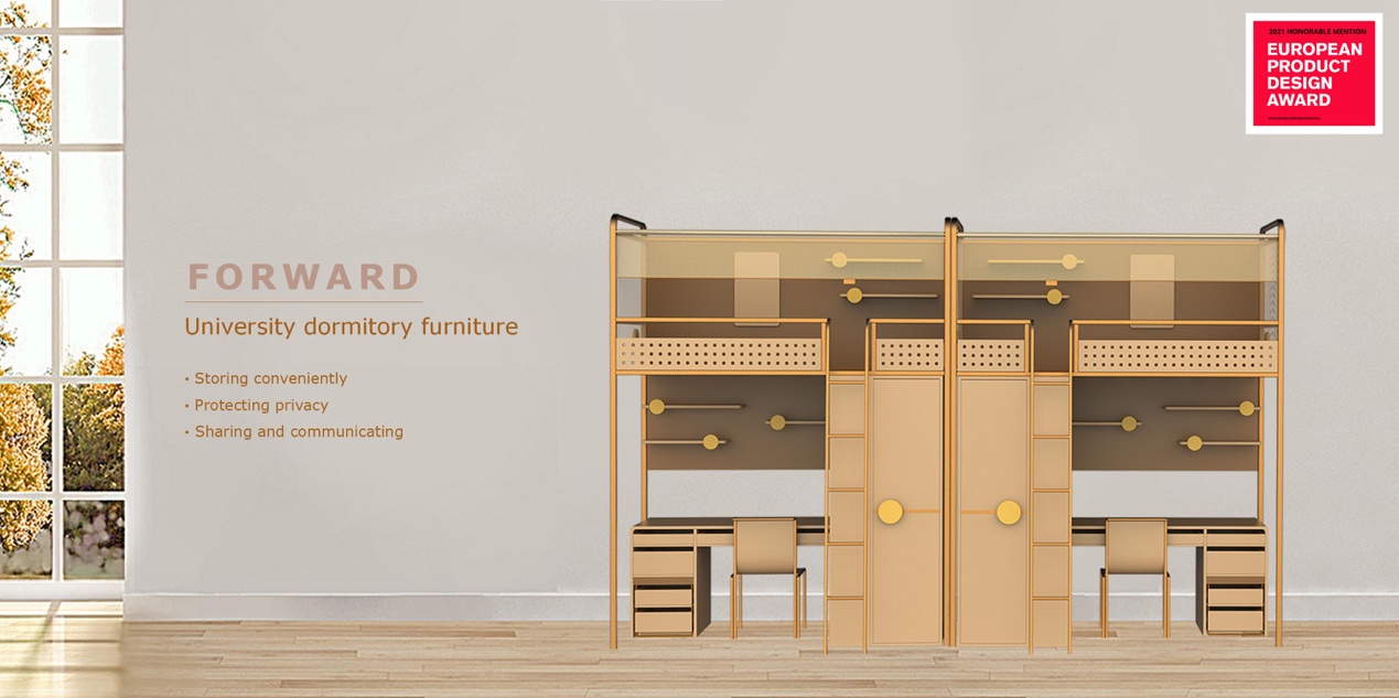 这是一款为“浙江惠美”开发的大学寝室家具。设计主题是“向前”,即在寝室中营造“积极向前”的氛围。本设计既注重“个人空间”的塑造,又注重“与他人交流”的功能,为学生营造健康舒适的校园寝室环境。这有助于新时代大学生生理、心理方面健康成长。本次设计主要从物品收纳、保护个人隐私、他人交流、个性装饰、促进学习等方面进行创新。