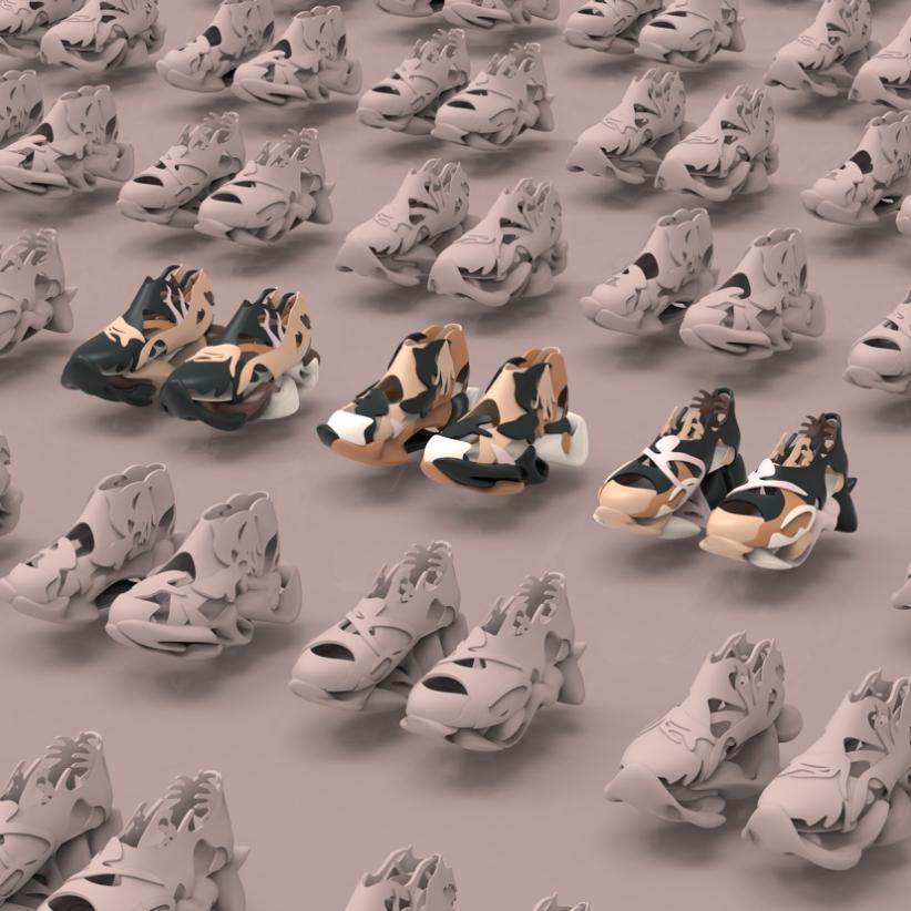 作者将配色方案和特征元素导入到自主研发的“鞋履设计生成器”程序中,通过动力学模拟自动生成大量的三维设计方案。再对生成的方案进行筛选和修改,达到设计系列快速完成的目的。