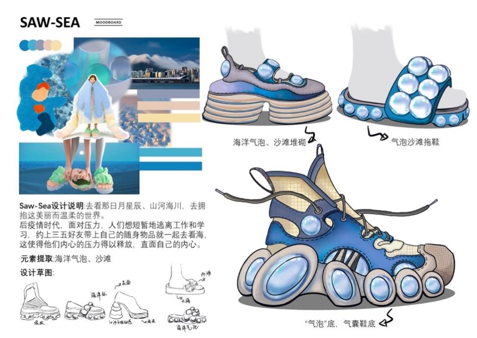 Saw-Sea,去看那日月星辰、山河海川,去拥抱这美丽而温柔的世界。后疫情时代,在压力巨大的现实生活中,人们想短暂地逃离工作、学习,约上三五好友带上自己的随身物品一起去看海,想到什么就即刻行动,这使得他们释放了内心的压力,找寻到自己的内心。于是用海相关元素进行鞋履设计,让他们可以在海上和生活上乘风破浪。