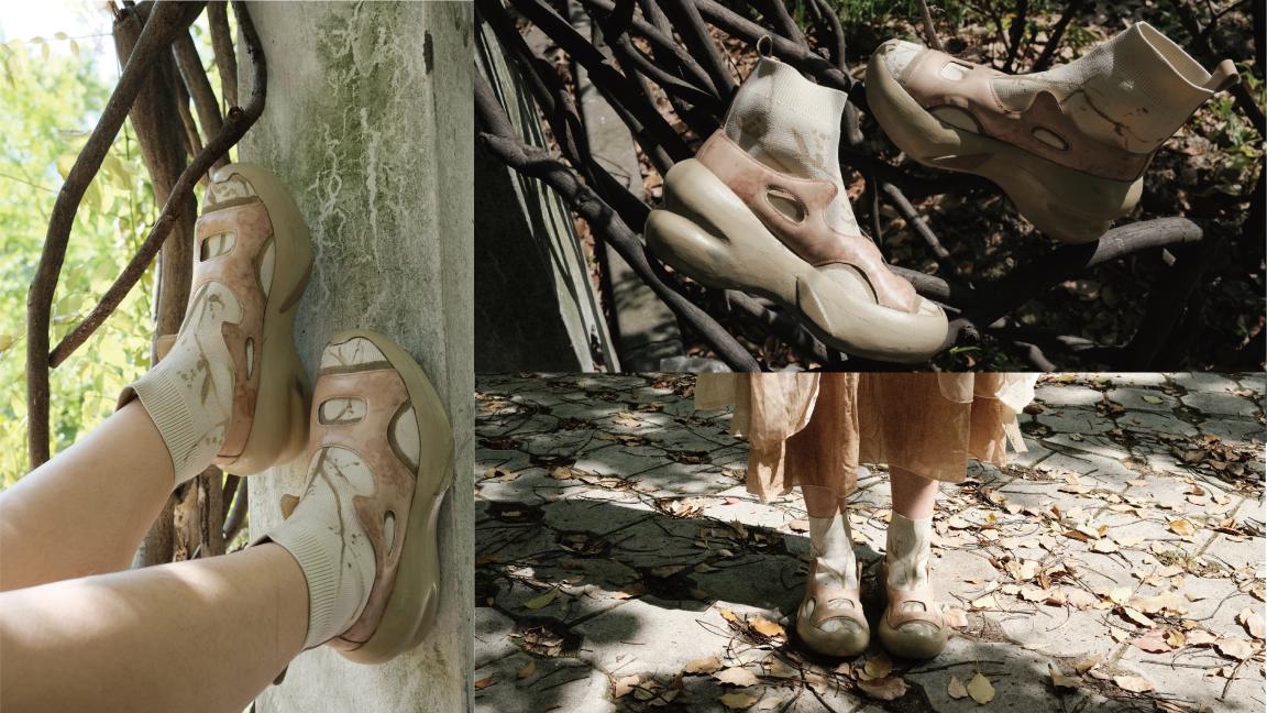 以光从稀疏的树缝中透过投射在大地上的画面为设计灵感,设计的一款充气袜靴。充气的方式可以实现方便收纳,高舒适度,方便穿脱的效果。帮面的充气部分就像交错的树枝,阳光照在鞋子上,袜靴上手绘的影子宛如稀疏的树影。