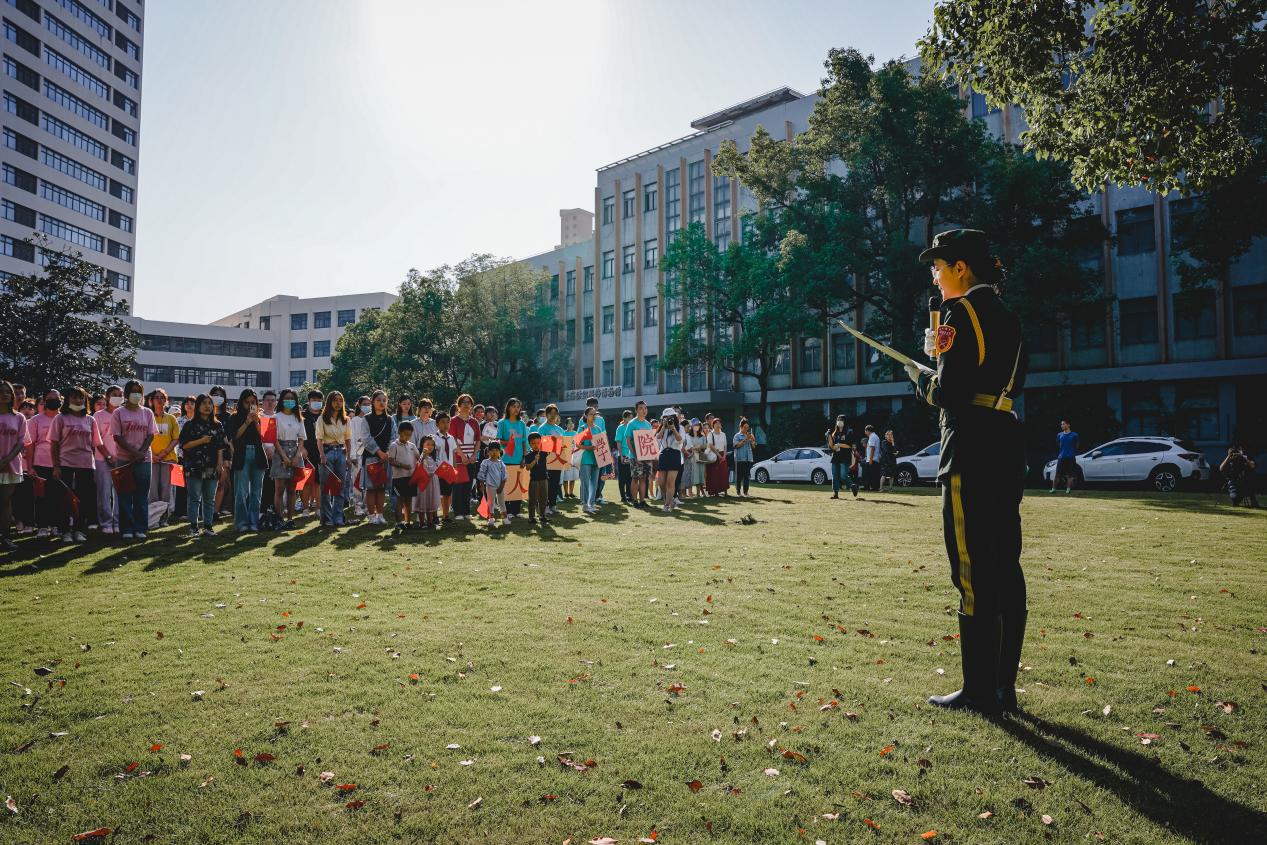 随后,东华大学国旗护卫队队员来自卓越服装2101班的孙怡宁进行了《庆建党百年,迎七秩华诞,庆祝新中国成立72周年》的国旗下主题演讲。从伟大的建党精神,讲述了共产党百年征程的波澜壮阔到百年初心的历久弥坚。同时,今年恰逢学校七十周年校庆,孙怡宁呼吁东华学子在东华求真知、悟真理、学做人、勇担当,激发了在场师生爱校荣校的认同感与归属感。在赞美新中国七十二年间的沧桑巨变的同时,孙怡宁呼吁新时代的青年大学生要以实现中华民族伟大复兴为己任,增强做中国人的志气、骨气、底气,不负时代,不负韶华,不负党和人民的殷切期望。