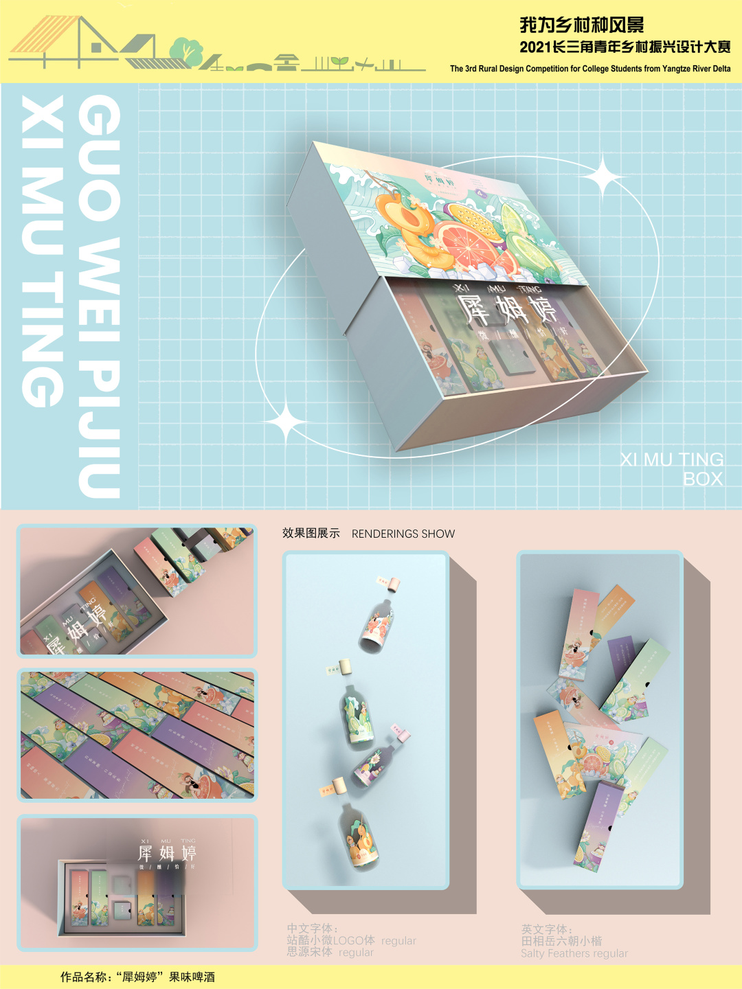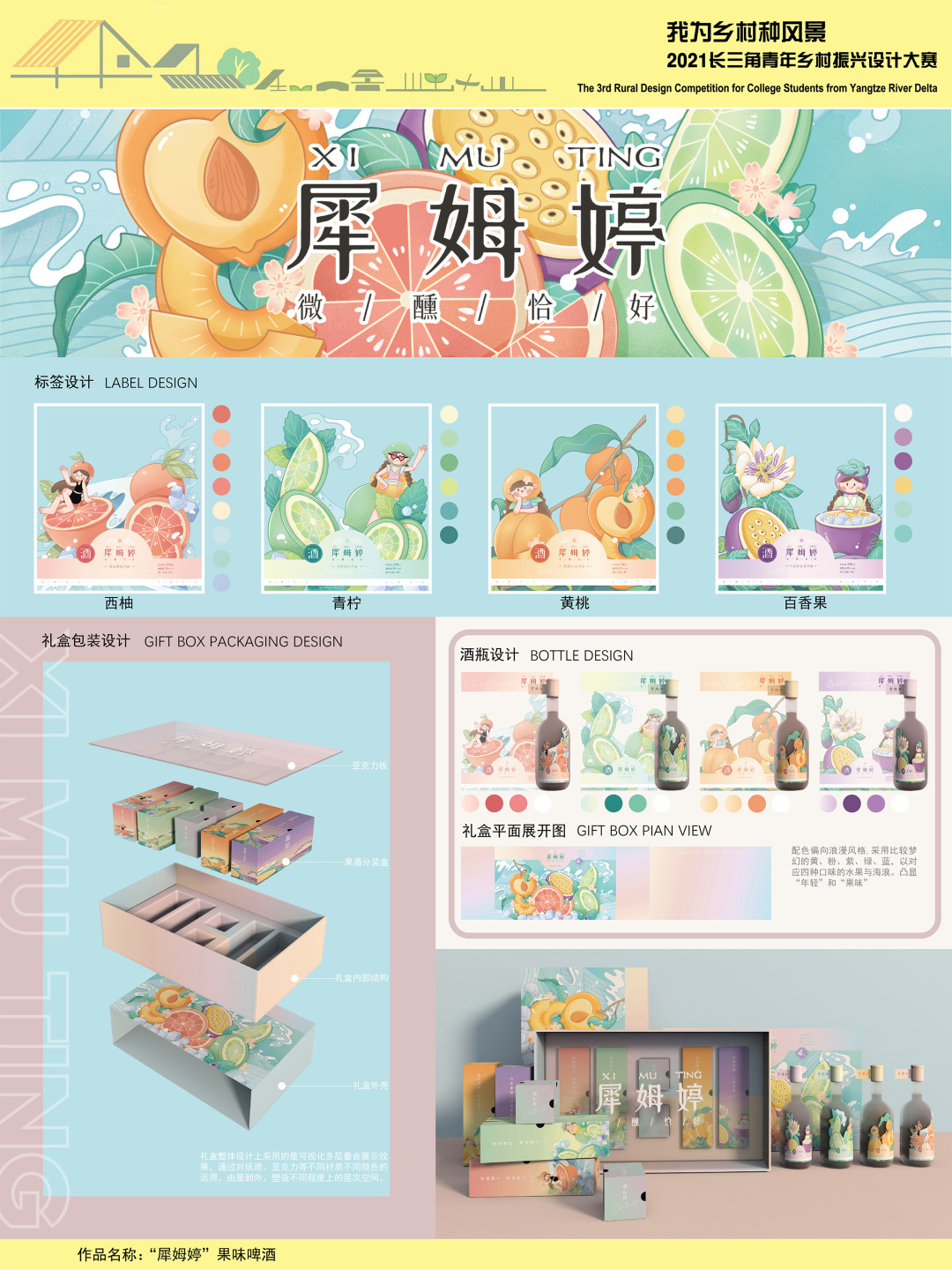 设计中将这四种水果进行元素提炼,设计了四种插画,并将插画进行标签设计以及包装设计。整体配色偏向浪漫风格,采用比较梦幻的黄、粉、紫、绿、蓝,以对应四种口味的水果与海浪,凸显“年轻”和“果味”。果酒瓶的材质上选用了磨砂质地,更显果酒朦胧香甜。镂空的标签设计凸显“年轻”和“趣味”。礼盒整体设计上采用的是可视化多层叠合展示效果,通过对纸质、亚克力等不同材质不同颜色的运用,由里到外,塑造不同程度上的层次空间。