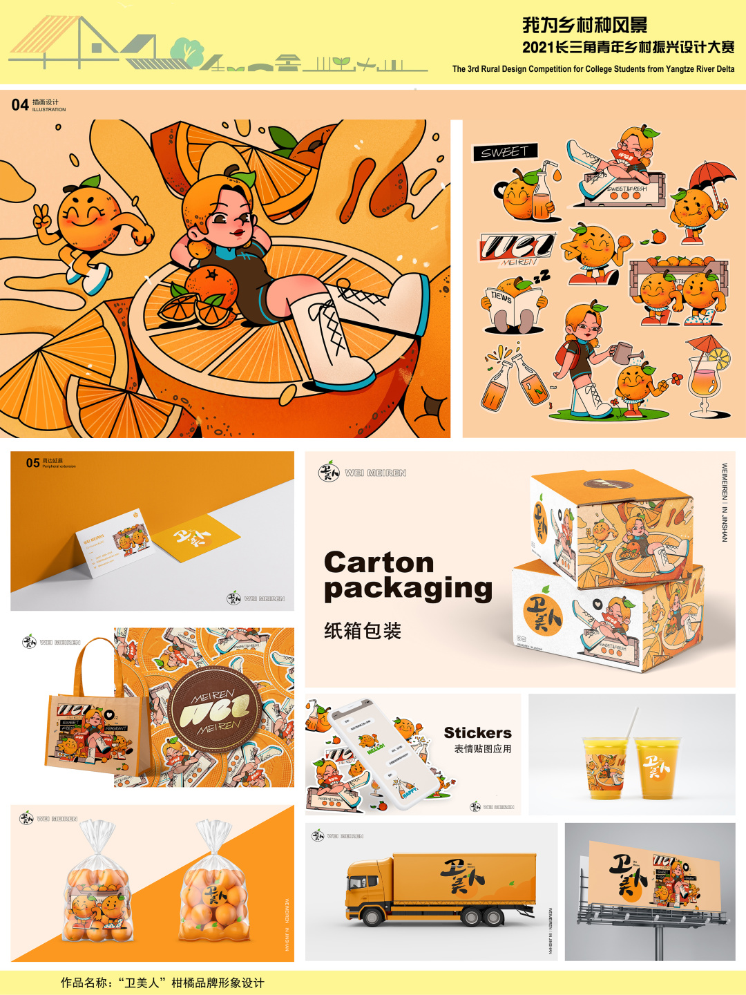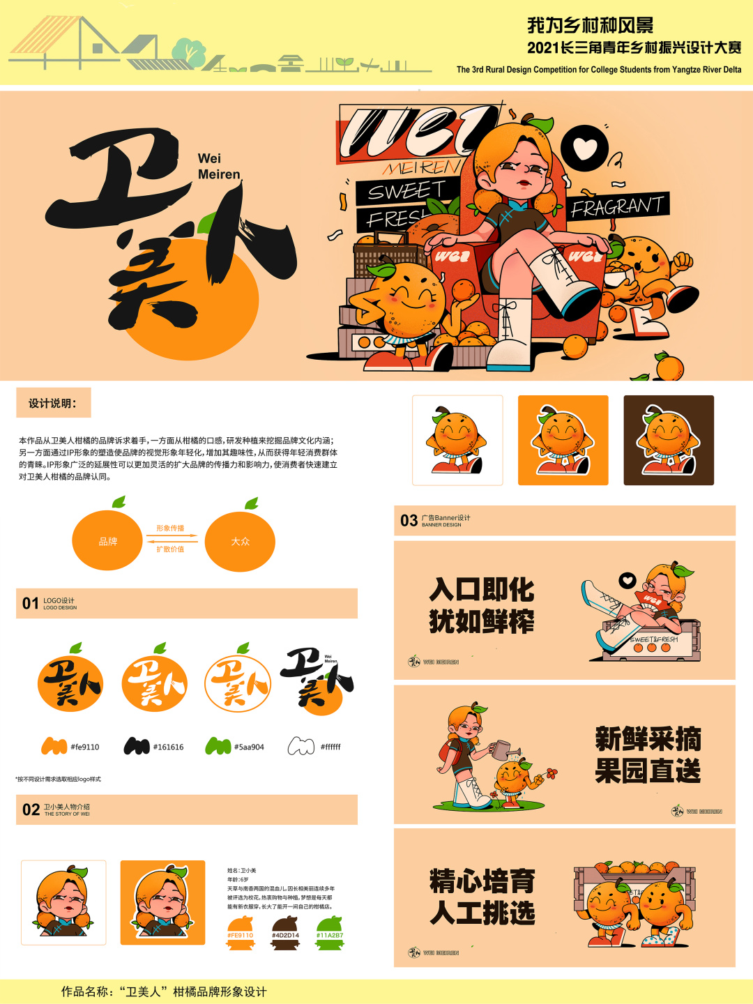 设计从卫美人柑橘的品牌诉求着手,一方面从柑橘的口感,研发种植来挖掘品牌文化内涵;另一方面通过IP形象的塑造使品牌的视觉形象年轻化,增加其趣味性,从而获得年轻消费群体的青睐。IP形象广泛的延展性可以更加灵活的扩大品牌的传播力和影响力,使消费者快速建立对卫美人柑橘的品牌认同。