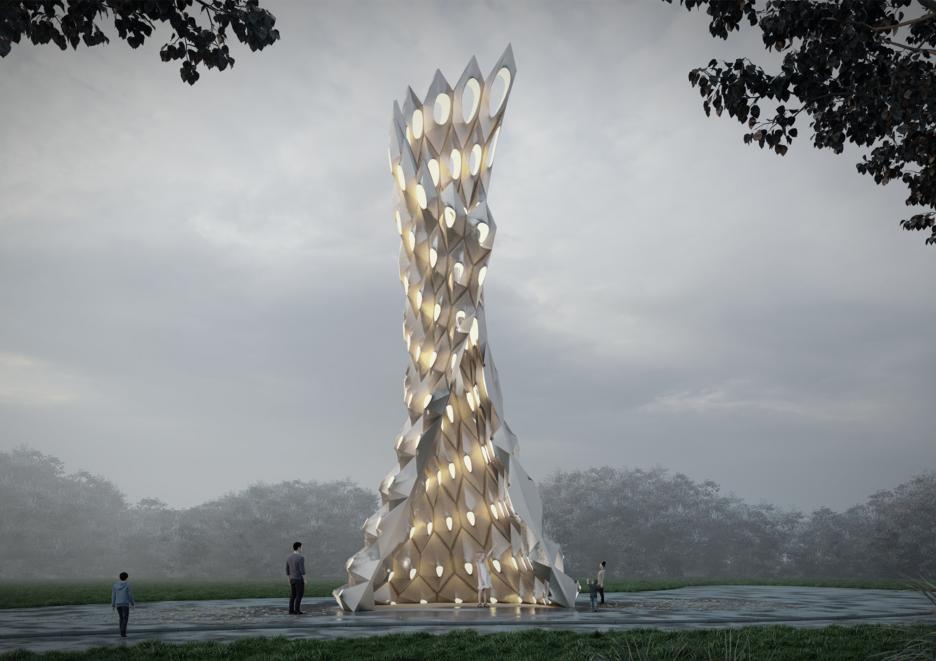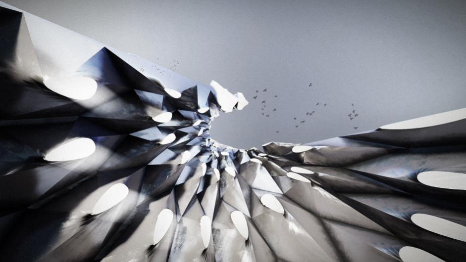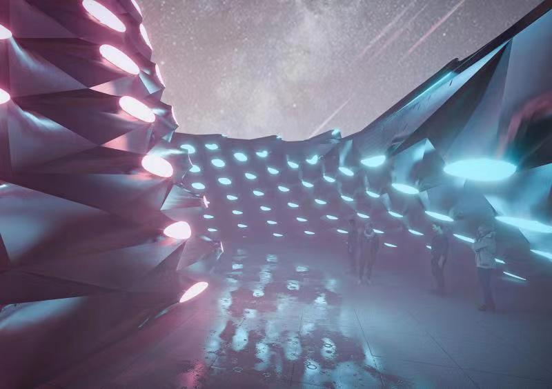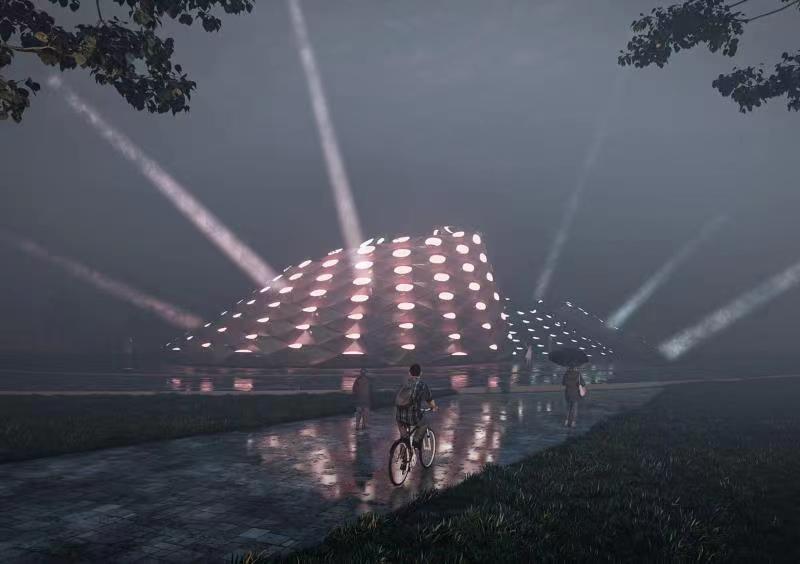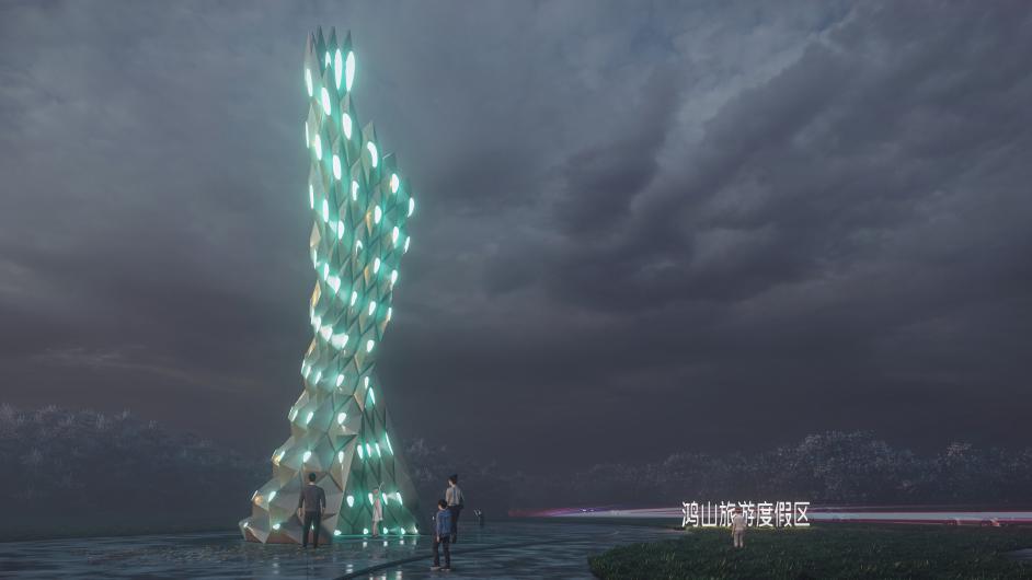 “翩若惊鸿”是一件数字互动装置艺术作品。艺术与技术的结合能够更好实现创作效果,我们把吴文化视觉符号使用参数化设计手法应用在洪山旅游度假区标志物设计中,用数字手段再现历史文化并实现审美共情。这件作品分为两个部分,使用相似的螺旋向上结构,25米的高度实现度假区入口标志物的可识别功能,15米的平铺直径实现度假区中心广场空间尺度的可达性,夜间效果结合声光手段使体验感更加丰富。在创作过程中,科技发展,给我们的想象力插上现实的翅膀,也在自由释放数字设计的魅力。