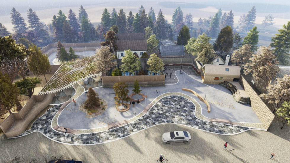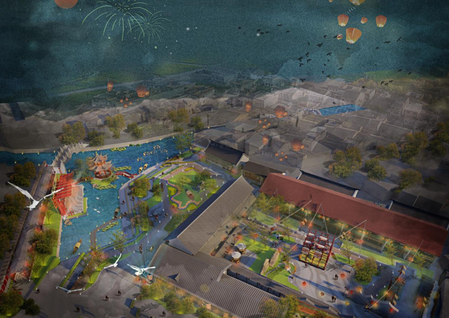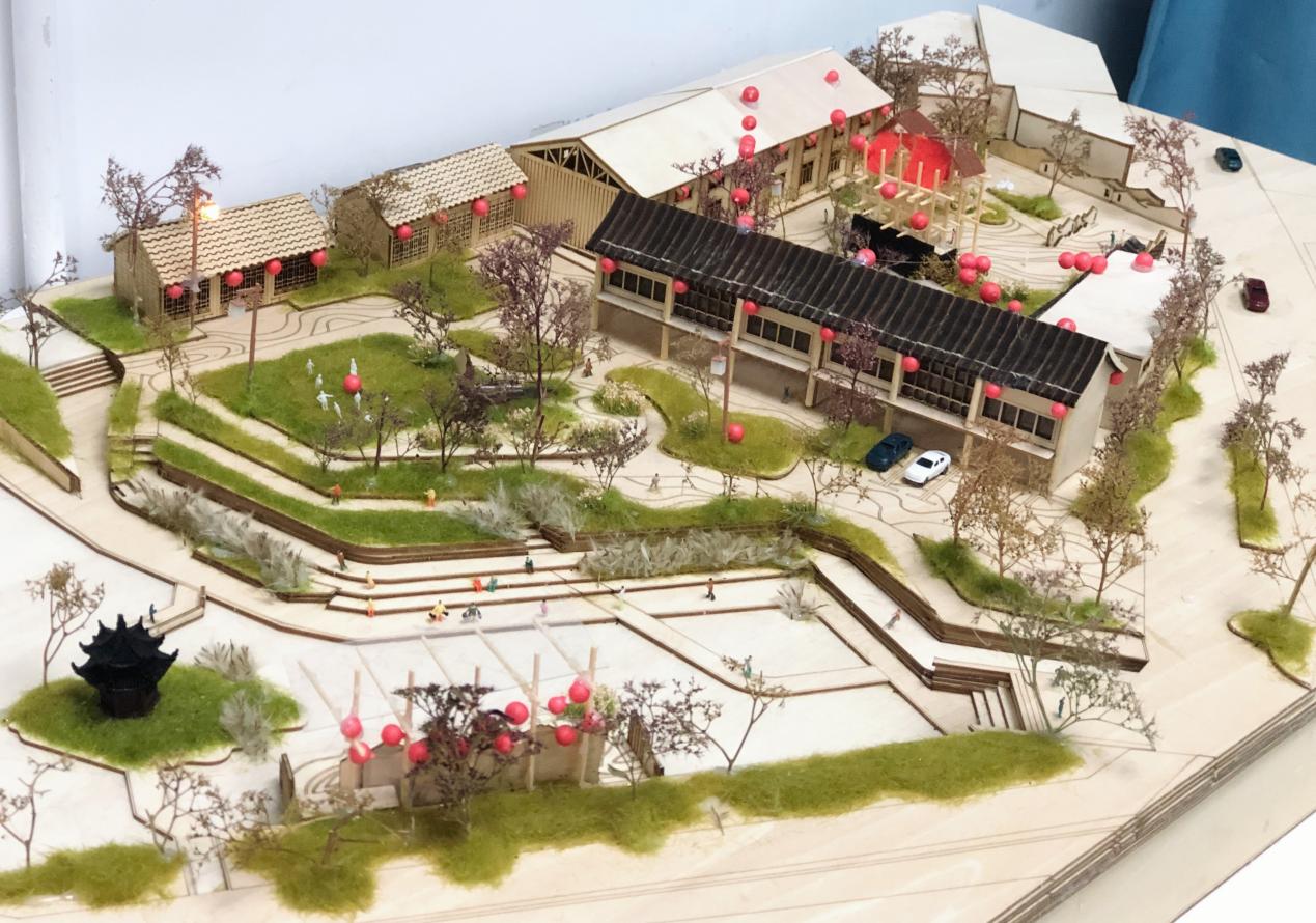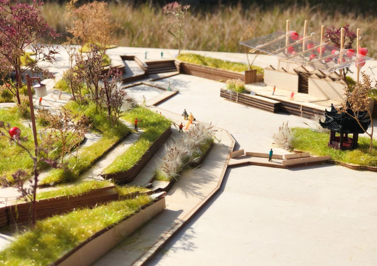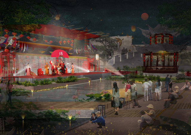 设计灵感来源于该地特有的码头、锡剧等文化元素,巧借景观节点将各个元素进行展现。场地右侧打造围合的合院空间,以特色流水铺装为主,并设置园林节点,欲将该地打造为集会、展览、互动、休闲一体的院落空间;建筑作为展览展示场地,展示锡剧文化、码头文化的历史发展;并在场地定制临时可移动装置,可变换三种形式,利用晾晒布匹的形式,展示锡剧元素,打造特色展示空间,活化围合场地,既作为村民集会活动空间,又可吸引外地游客了解当地文化。场地左侧打造开放滨水空间:将原本闭合的临水空间打开,因地制宜,利用码头的形式形成开放的滨水空间,并设置临水戏曲舞台,供当地居民游玩,并向外来游客展示锡剧文化,形成滨河小剧场,也开拓景观视野,增加人们的亲水性。建筑则作为体验当地非遗文化的场所。场地中间的部分建筑进行改造,将二层打造成观景阁楼,一层则是开放底层,连通左右两侧,巧借锡剧《红楼梦》一语双关,红楼复梦,梦为戏剧,楼为园景。