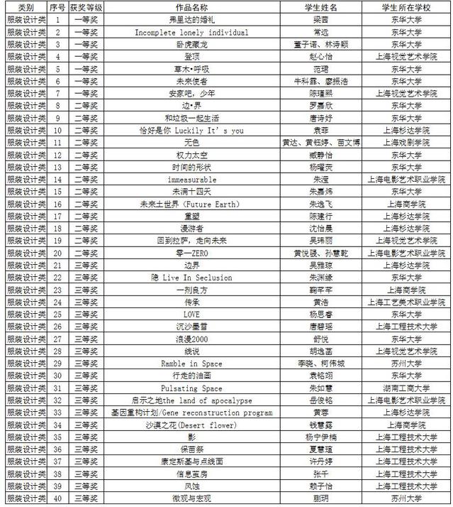 第七届“汇创青春”——上海大学生文化创意作品展示活动(服装设计类)获奖名单