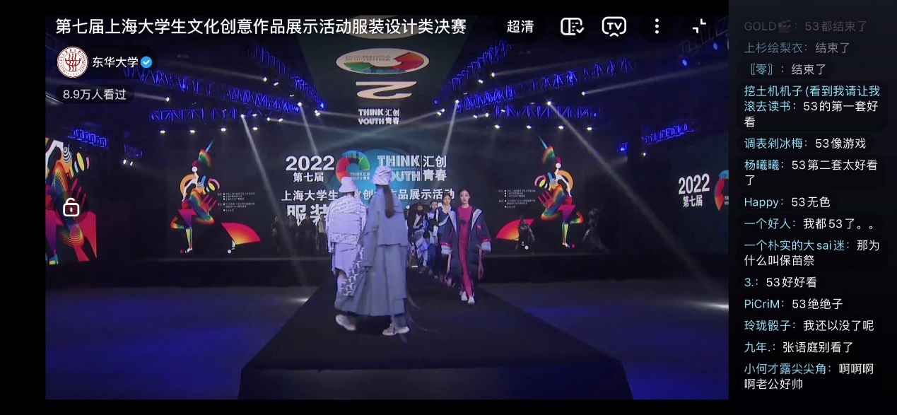 由上海市教卫工作党委、市教委主办、东华大学承办的第七届“汇创青春”上海大学生文化创意作品展示活动“服装设计类”决赛在安莎国际会议中心E2馆(黄浦区外马路1353号)顺利举办,并于2022年7月3日通过东华大学抖音和爱奇艺进行动态直播。组委会克服了疫情防控的种种困难,保证了作品发布的顺利举行,参赛选手感动地说:没想到自己的毕设作品还可以进行动态展示,十分感谢汇创青春的平台给了展示自己的机会。”