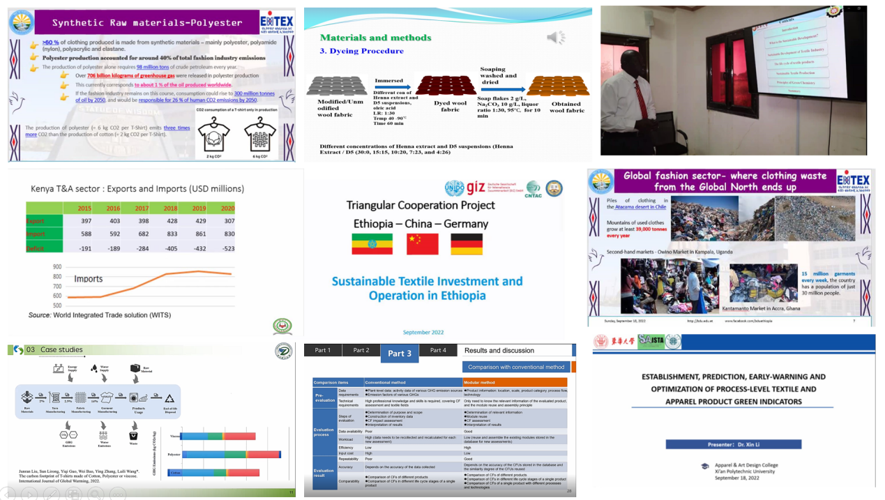 为了促进中国与非洲国家纺织服装业绿色发展的沟通与合作,在上海市科学技术委员会“科技创新行动计划”“一带一路”研究项目支持下,手机博彩平台betway必威安卓版 研究团队邀请了来自东华大学、德国国际合作机构(GIZ)、苏丹喀土穆工业研究与咨询中心(IRCC)、苏丹杰济拉大学、肯尼亚莫伊大学、肯尼亚技术大学、埃塞俄比亚巴赫达尔大学、浙江理工大学、西安工程大学、英国曼彻斯特大学等10所“一带一路”国家知名机构和大学高校的专家学者,于2022年9月18日通过线上会议,成功举办了“2022中非纺织服装国际论坛暨中非文化交流论坛”分论坛,以 “纺织服装绿色发展”为主题,分别从跨国合作的重要性、国家层面的可持续发展现状、生态友好型技术与举措(可持续染色工艺、二手服装的回收)、纺织产品绿色水平指标的建立及环境影响评价的创新性方法等角度进行研讨,收获各方一致好评。