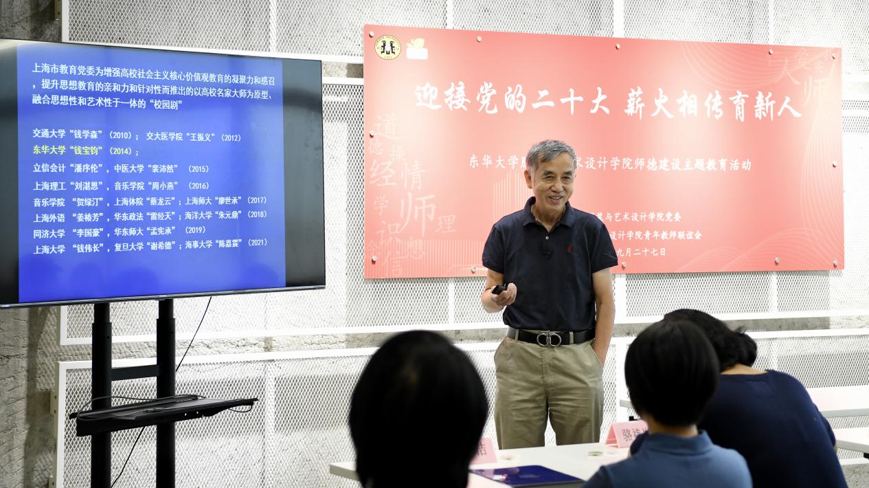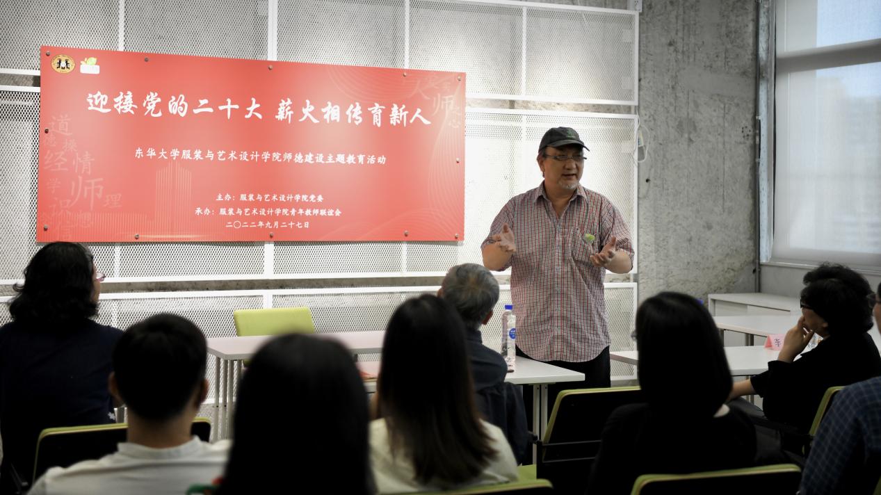 作为东华大学学术委员会、学位委员会委员,全国艺术专业学位研究生教育指导委员会委员,教育部高等学校设计学类专业教育指导委员会委员的冯信群教授对于学科建设一直有着深入的思考,他分享了自己关于设计学科建设的感悟,寄语青年教师关注新工科、新文科建设发展,让学科及时适应时代变化。冯老师用“千教万教教人求真,千学万学学做真人”和“志于道,据于德,依于仁,游于艺”勉励青年教师们培养学生全面发展,做立德树人的“大先生”。