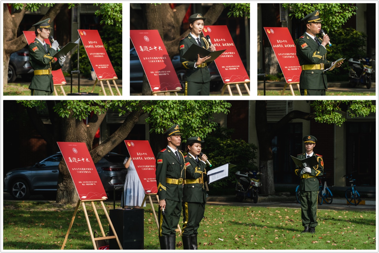 10月1日早上8点,学院国旗护卫队党支部在延安路校区举行“喜迎二十大,永远跟党走,奋进新征程”庆祝新中国成立73周年主题升旗仪式。升国旗仪式后,国旗护卫队队员进行了《喜迎二十大,争做时代新人》主题演讲、“抗疫先锋”故事诗朗诵、共读了“参军学生的一封家书”,情感真挚传达了青年大学生的家国情怀。