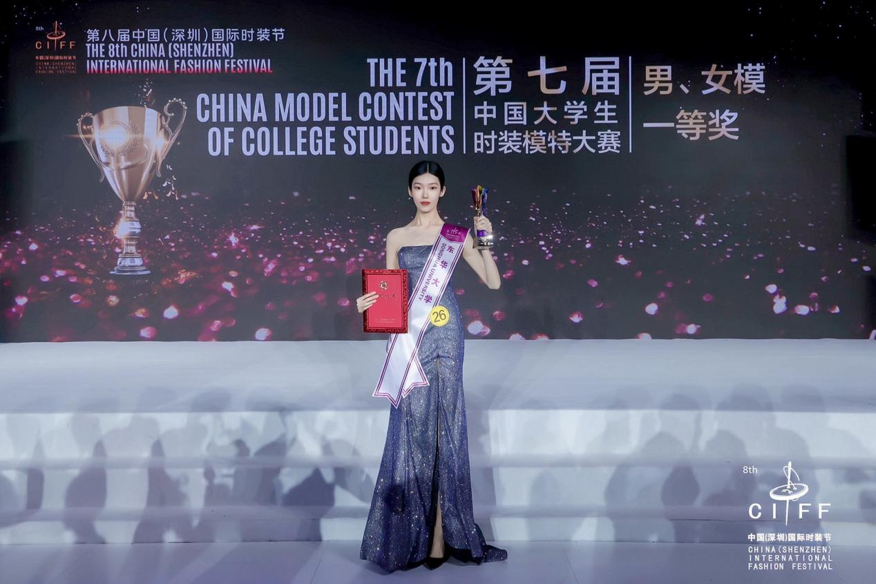 20221224日晚,第七届中国大学生服装模特大赛总决赛在深圳举行。来自全国54所院校82位选手大展身手,经过激烈角逐,来自我校服装学院表演系服装表演专业20级的张甜同学荣获第七届中国大学生服装模特大赛一等奖。