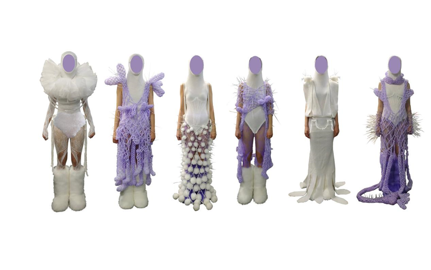 来自东华大学中日合作服装设计专业的陶潇婷用作品《第二次生命》,为观众讲述了一尾美人鱼的童话故事。服装特别采用可降解环保空心纱材料,运用针织材料搭配玻璃纱簇绒、钩针等手法创造不同的肌理变化,以此来表达“可持续时尚”思考。